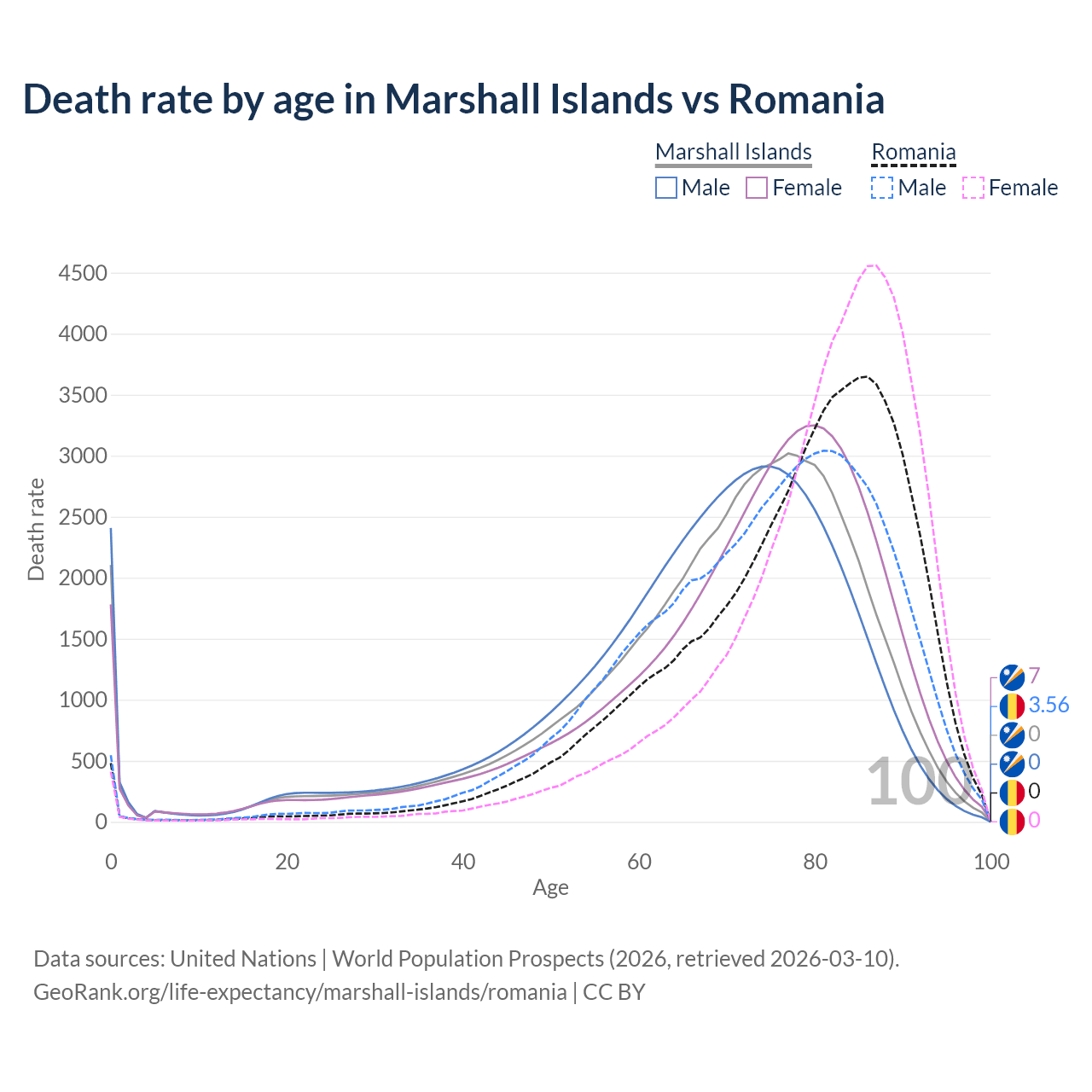 In the Marshall Islands, the most common age of death is 77, compared to 86 in Romania. The median age of death is 72 in the Marshall Islands and 79.9 in Romania, meaning only half of each cohort is expected to live past that age.