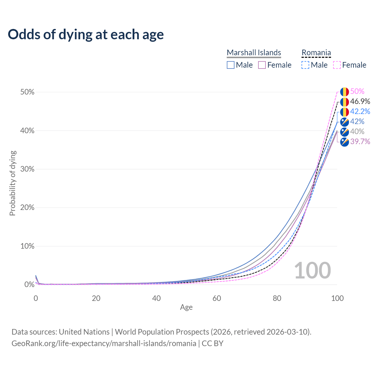 This life expectancy calculator shows the odds of living to 100, 95, 90, and below based on current age for both males and females in the Marshall Islands and Romania, along with mean and median age of death. The calculations are based on the 2026 life tables (actuarial tables) from the UN World Population Prospects.