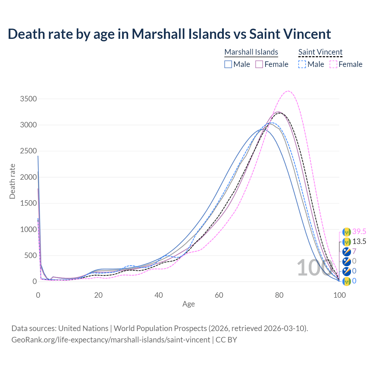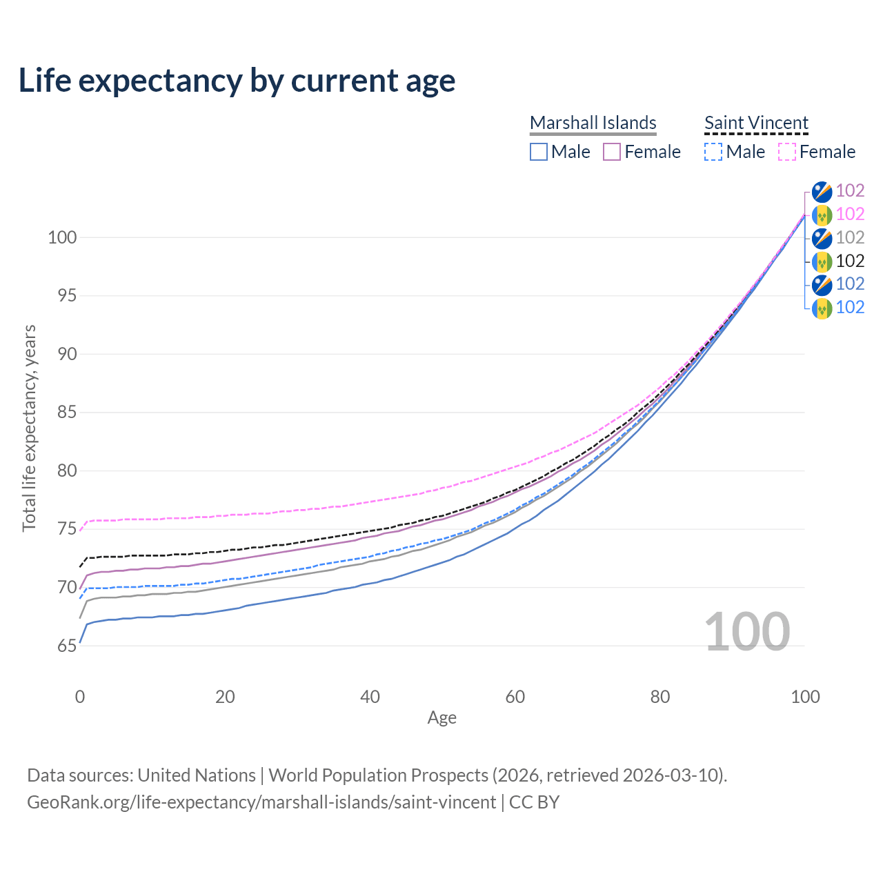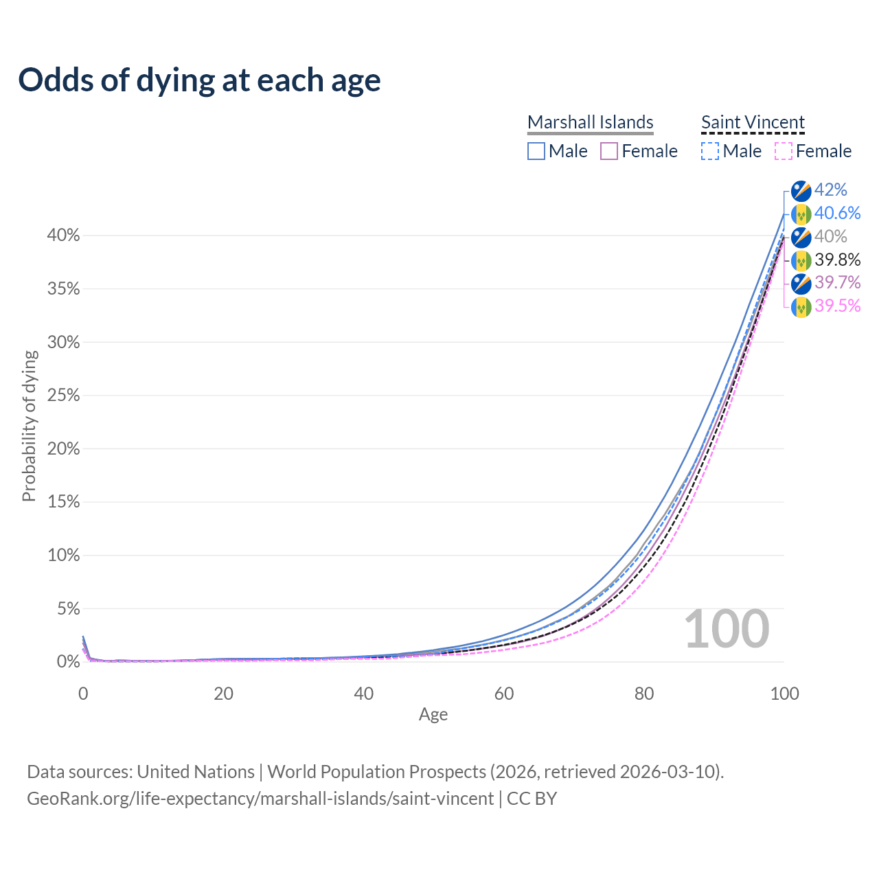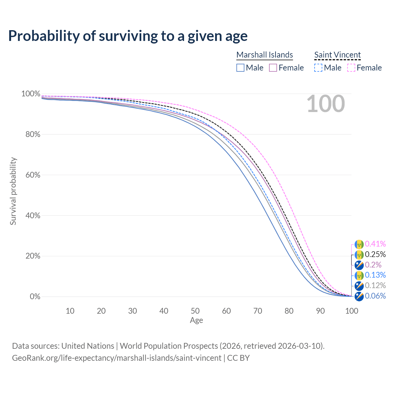 This life expectancy calculator shows the odds of living to 100, 95, 90, and below based on current age for both males and females in the Marshall Islands and Saint Vincent, along with mean and median age of death. The calculations are based on the 2026 life tables (actuarial tables) from the UN World Population Prospects.
