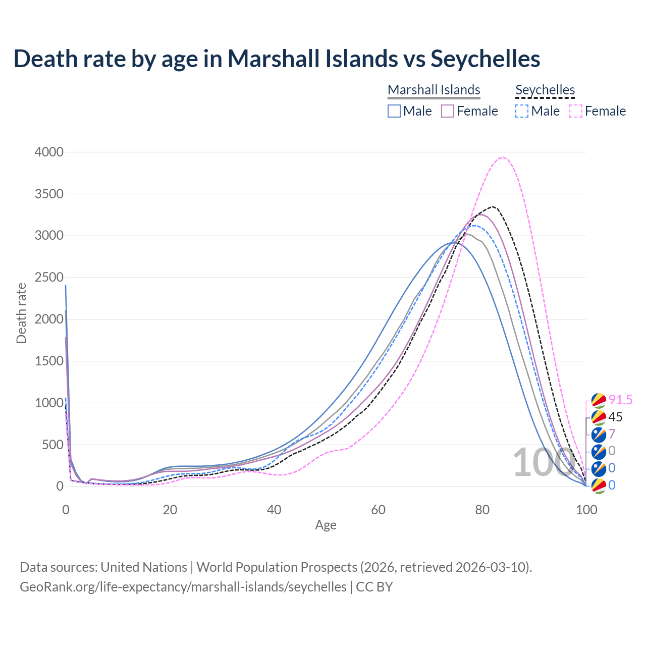 In the Marshall Islands, the most common age of death is 77, compared to 82 in the Seychelles. The median age of death is 72 in the Marshall Islands and 77 in the Seychelles, meaning only half of each cohort is expected to live past that age.