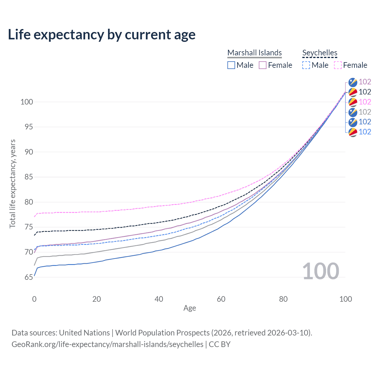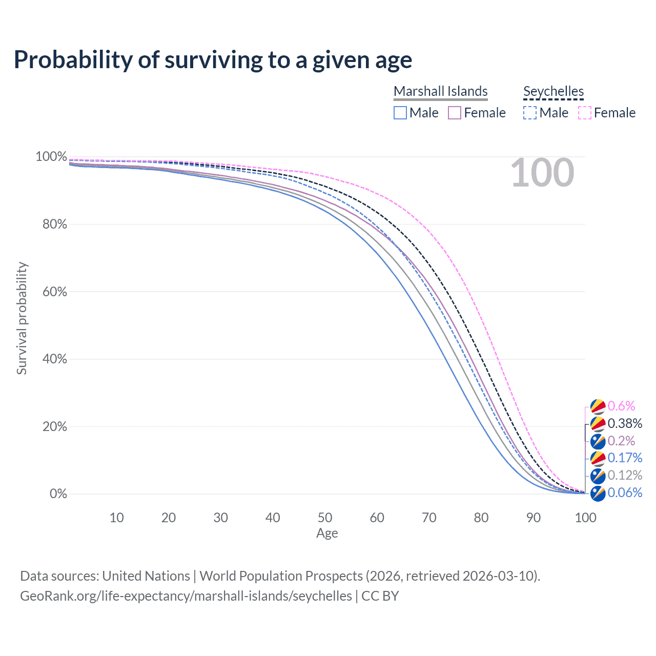 This life expectancy calculator shows the odds of living to 100, 95, 90, and below based on current age for both males and females in the Marshall Islands and the Seychelles, along with mean and median age of death. The calculations are based on the 2026 life tables (actuarial tables) from the UN World Population Prospects.
