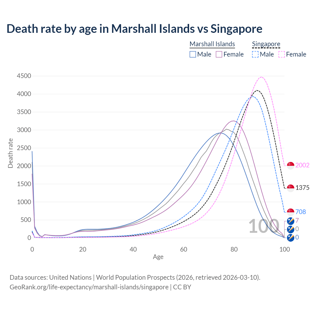 In the Marshall Islands, the most common age of death is 77, compared to 89 in Singapore. The median age of death is 72 in the Marshall Islands and 86.5 in Singapore, meaning only half of each cohort is expected to live past that age.