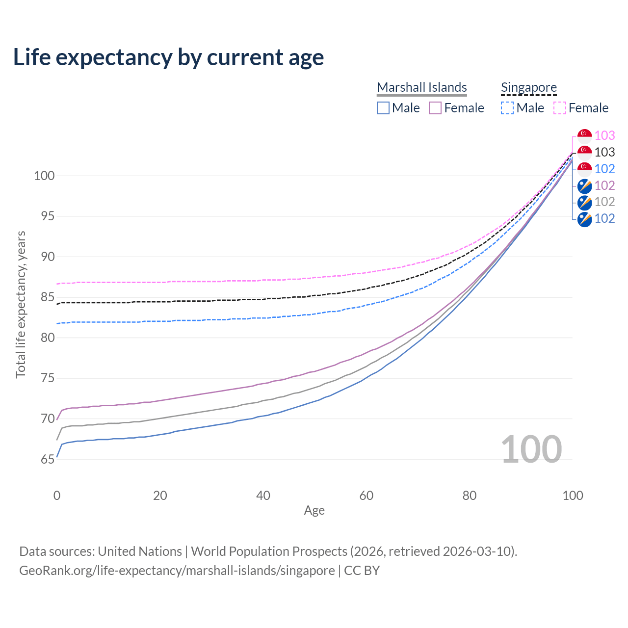 This life expectancy calculator shows the odds of living to 100, 95, 90, and below based on current age for both males and females in the Marshall Islands and Singapore, along with mean and median age of death. The calculations are based on the 2026 life tables (actuarial tables) from the UN World Population Prospects.