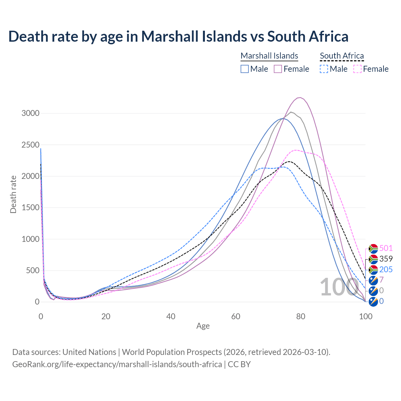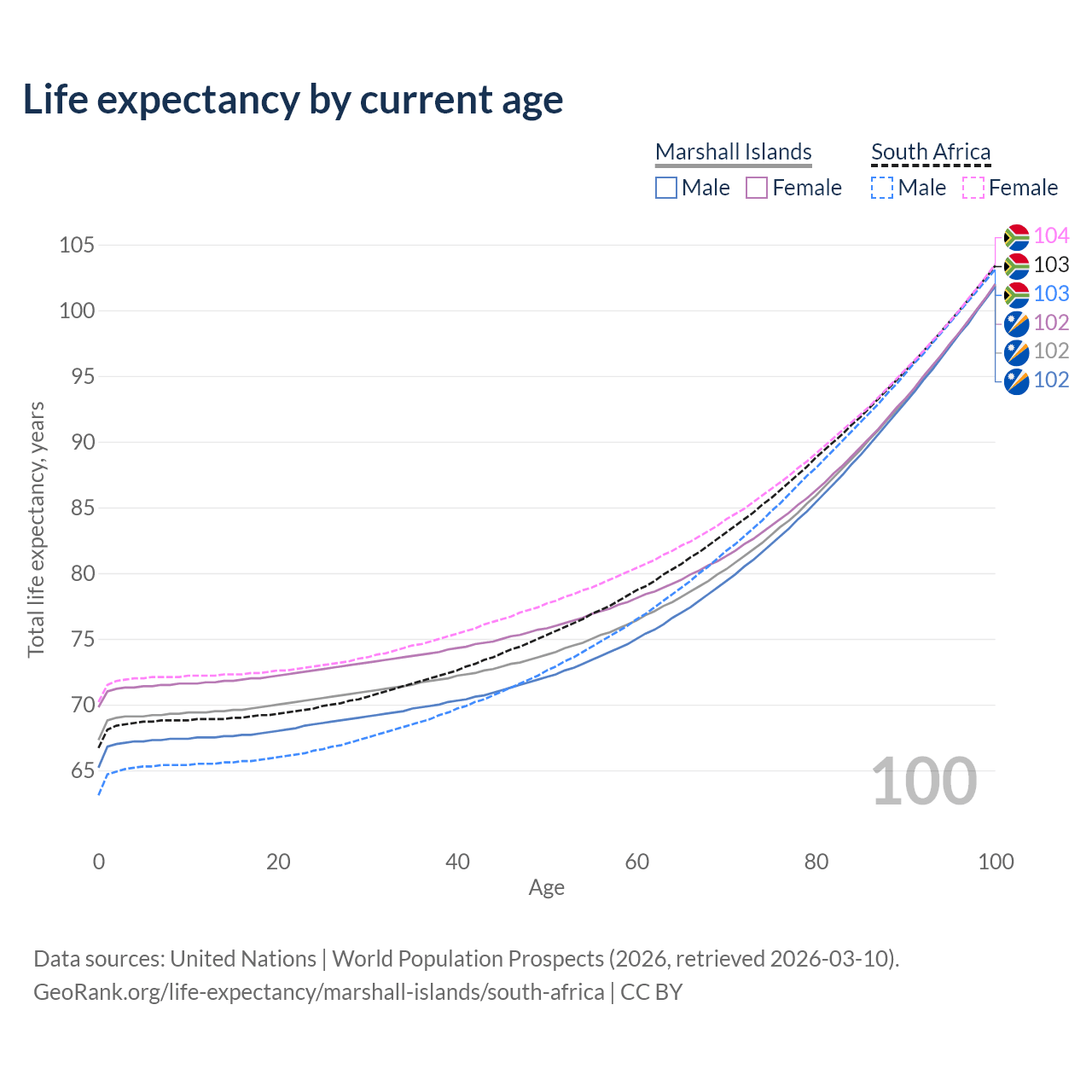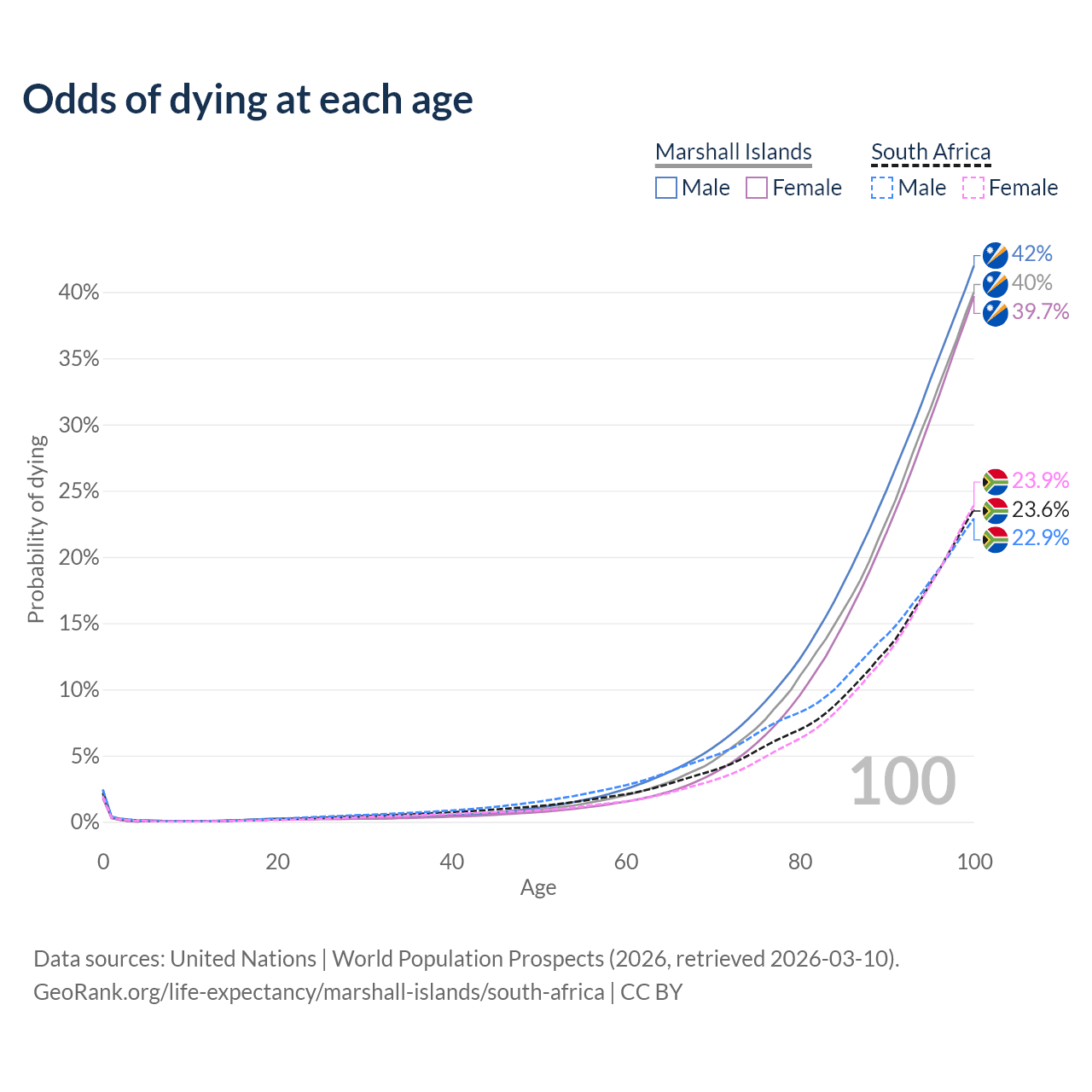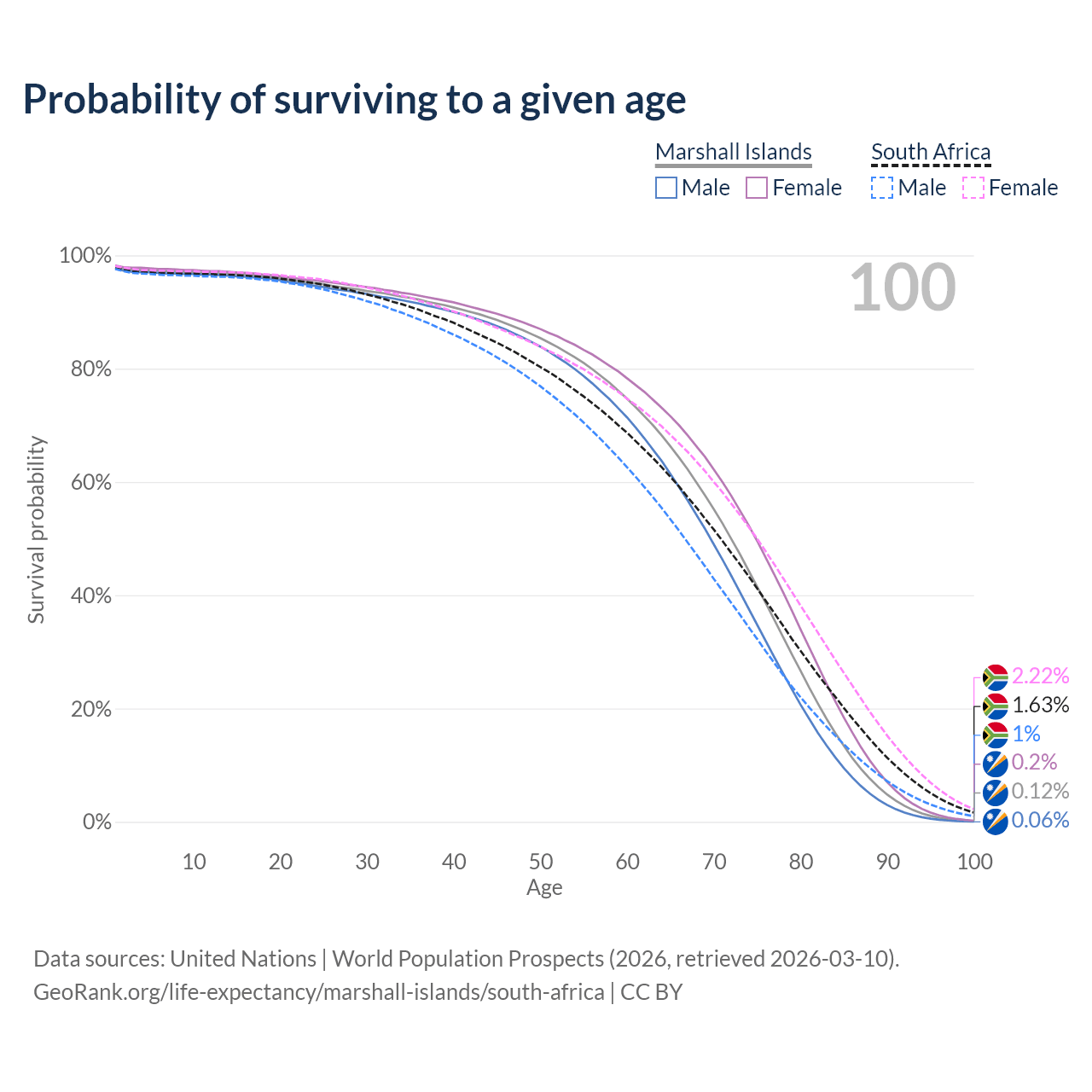 This life expectancy calculator shows the odds of living to 100, 95, 90, and below based on current age for both males and females in the Marshall Islands and South Africa, along with mean and median age of death. The calculations are based on the 2026 life tables (actuarial tables) from the UN World Population Prospects.