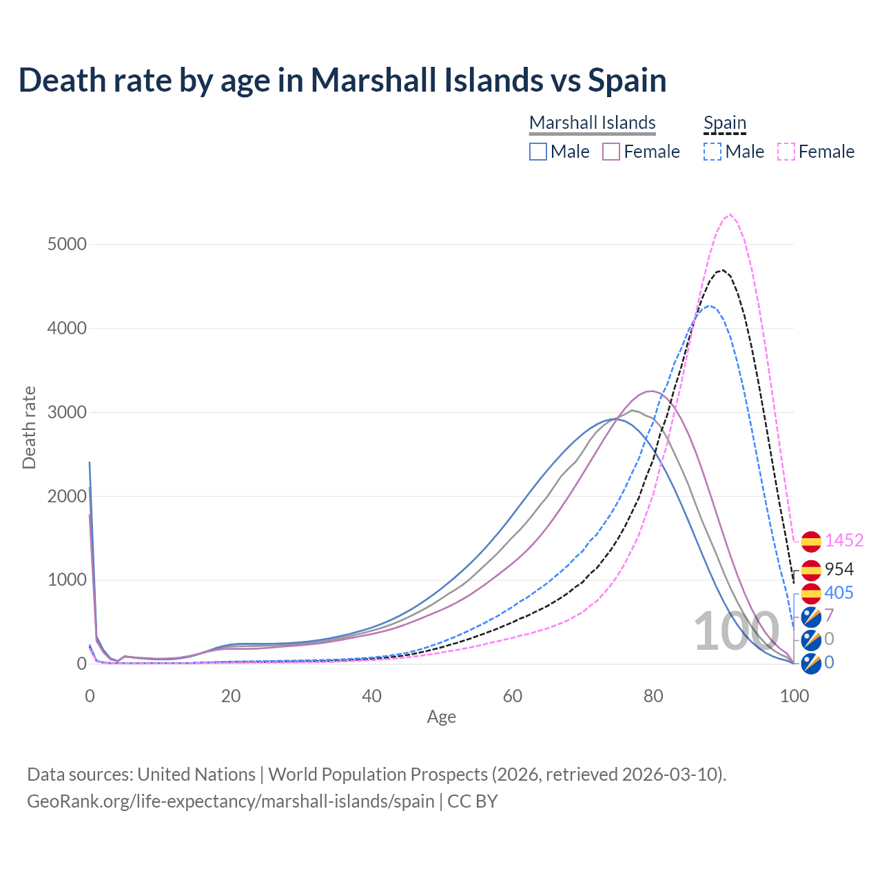 In the Marshall Islands, the most common age of death is 77, compared to 90 in Spain. The median age of death is 72 in the Marshall Islands and 87 in Spain, meaning only half of each cohort is expected to live past that age.