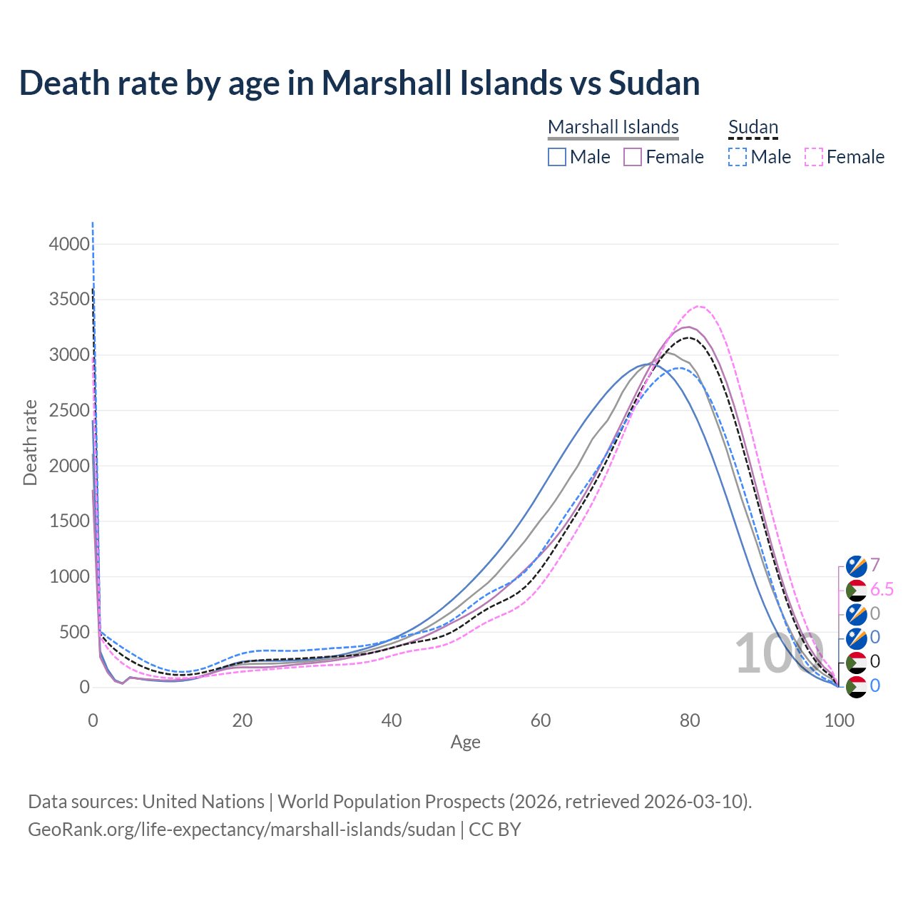 In the Marshall Islands, the most common age of death is 77, compared to 0 in Sudan. The median age of death is 72 in the Marshall Islands and 74.1 in Sudan, meaning only half of each cohort is expected to live past that age.