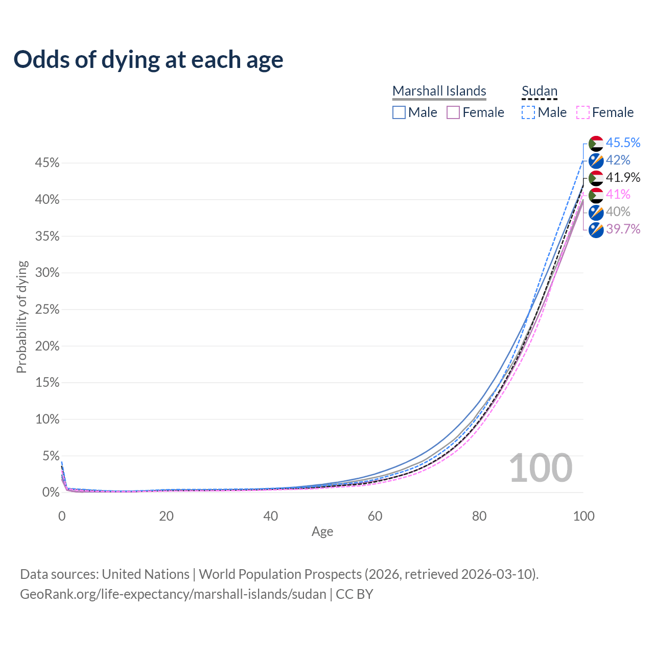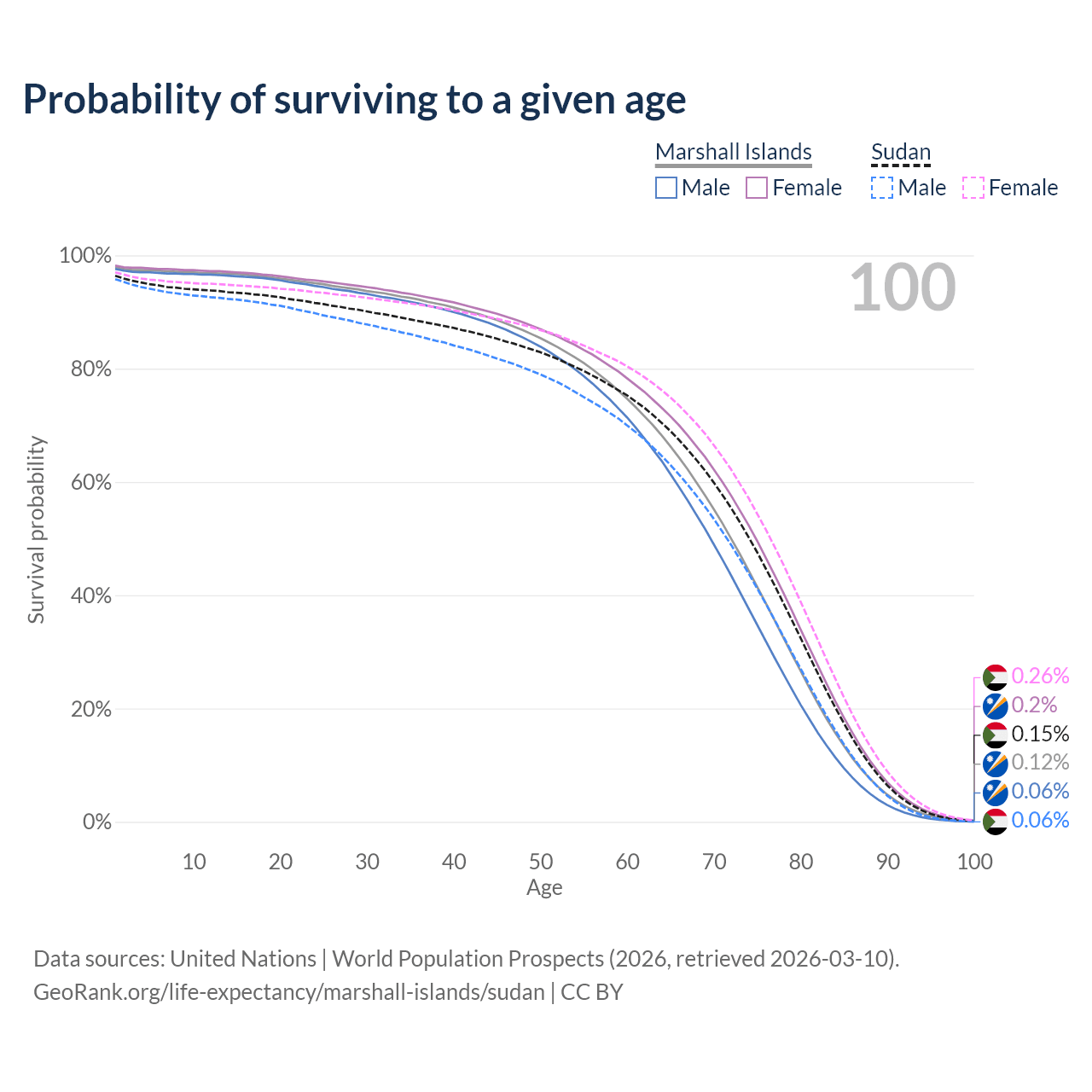 This life expectancy calculator shows the odds of living to 100, 95, 90, and below based on current age for both males and females in the Marshall Islands and Sudan, along with mean and median age of death. The calculations are based on the 2026 life tables (actuarial tables) from the UN World Population Prospects.