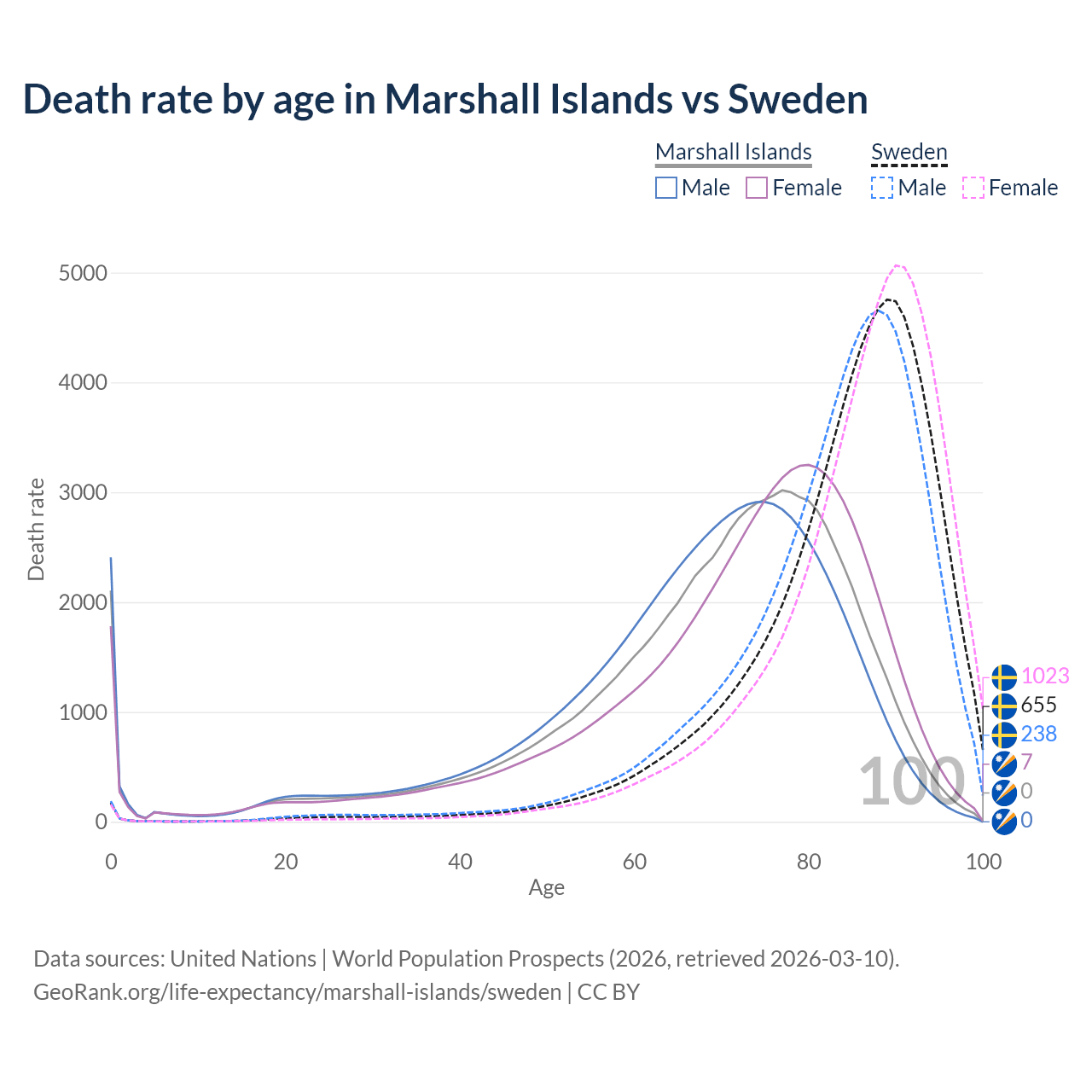 In the Marshall Islands, the most common age of death is 77, compared to 89 in Sweden. The median age of death is 72 in the Marshall Islands and 86.5 in Sweden, meaning only half of each cohort is expected to live past that age.