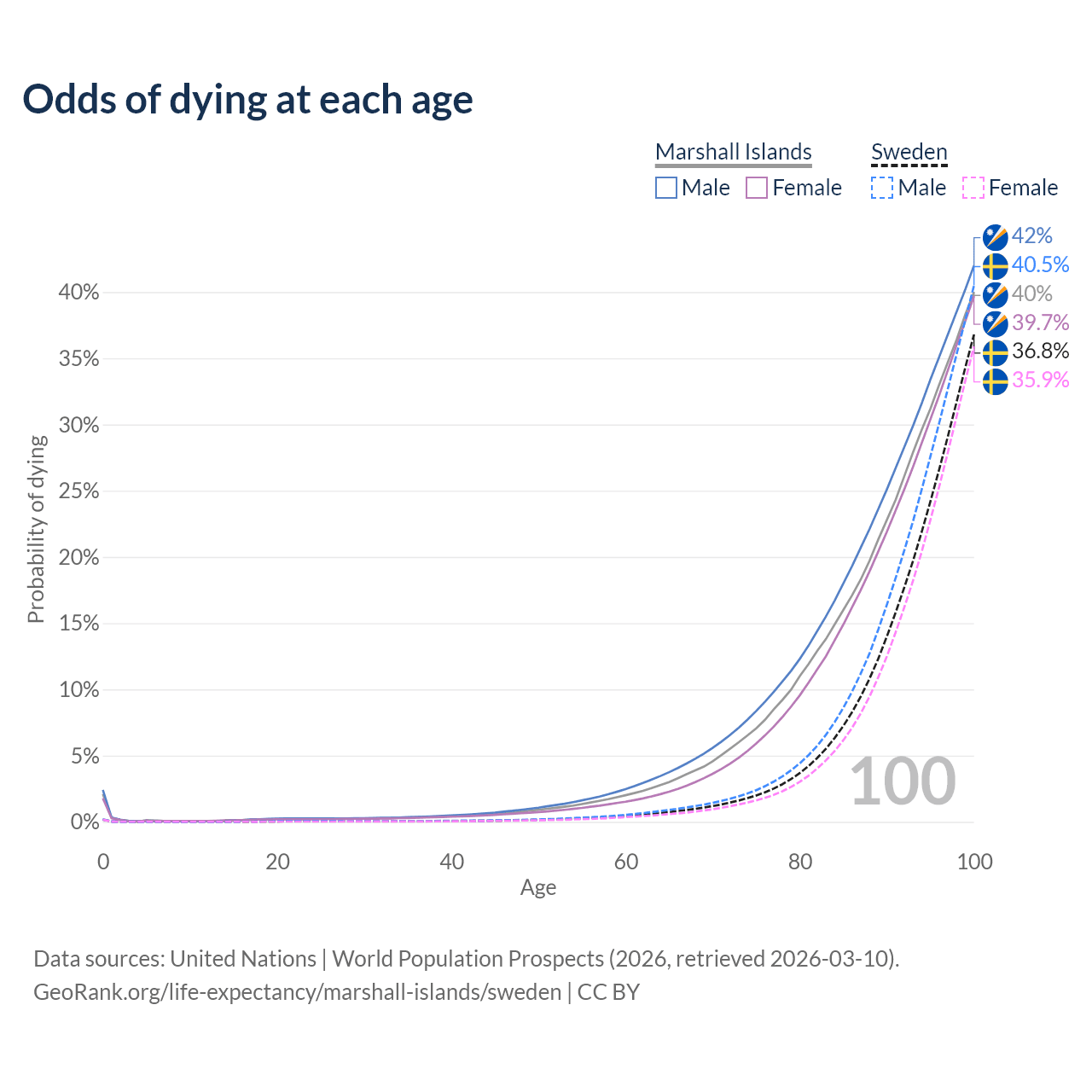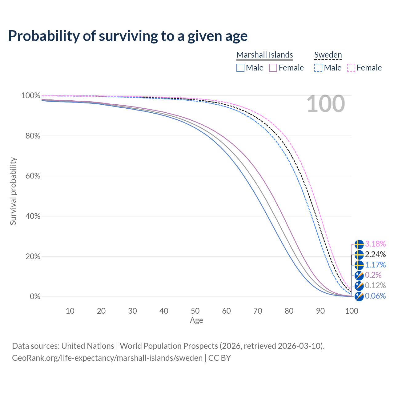 This life expectancy calculator shows the odds of living to 100, 95, 90, and below based on current age for both males and females in the Marshall Islands and Sweden, along with mean and median age of death. The calculations are based on the 2026 life tables (actuarial tables) from the UN World Population Prospects.
