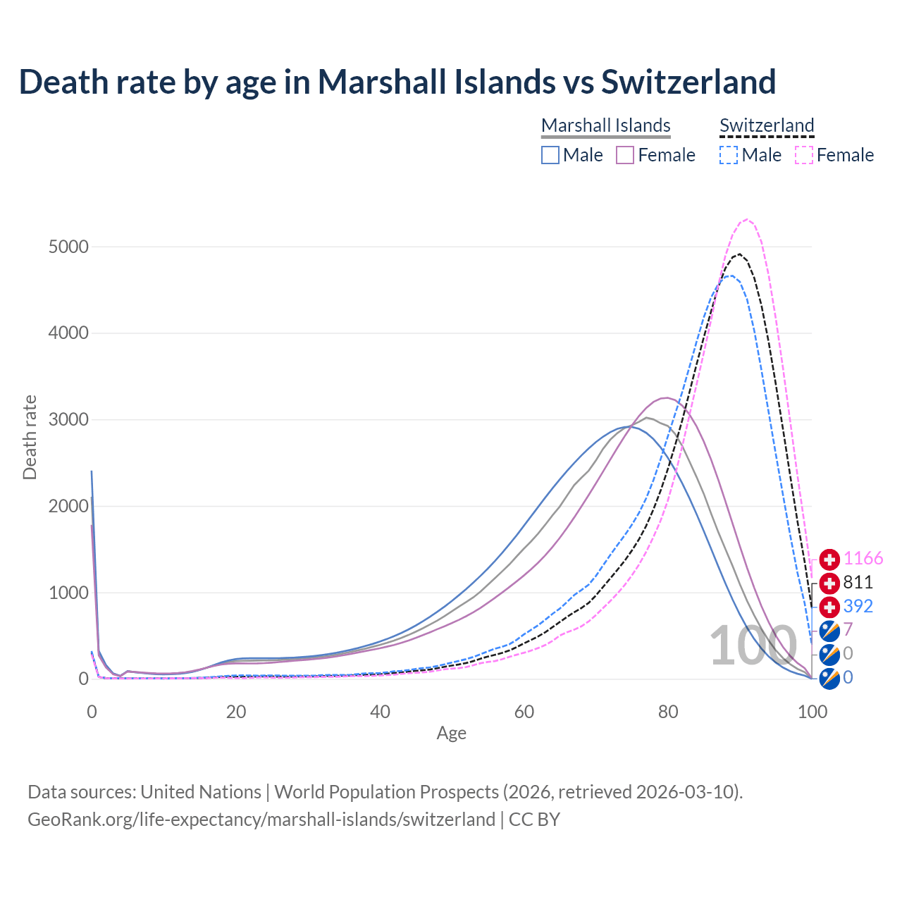 In the Marshall Islands, the most common age of death is 77, compared to 90 in Switzerland. The median age of death is 72 in the Marshall Islands and 87.2 in Switzerland, meaning only half of each cohort is expected to live past that age.