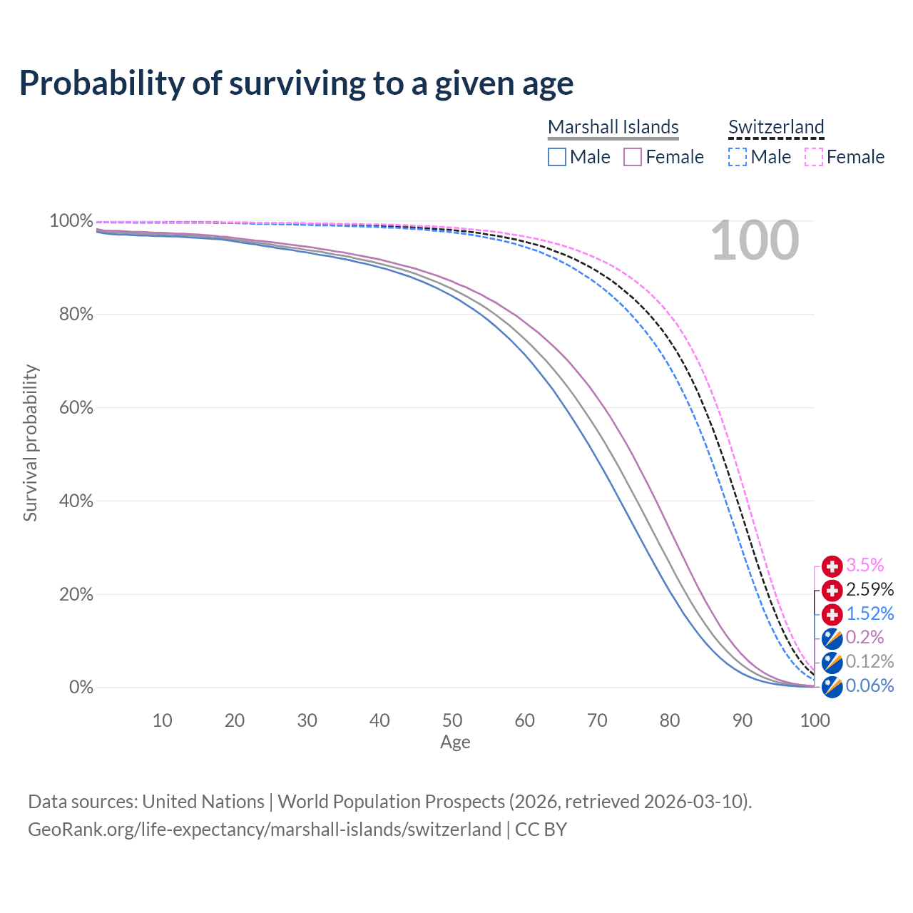 This life expectancy calculator shows the odds of living to 100, 95, 90, and below based on current age for both males and females in the Marshall Islands and Switzerland, along with mean and median age of death. The calculations are based on the 2026 life tables (actuarial tables) from the UN World Population Prospects.