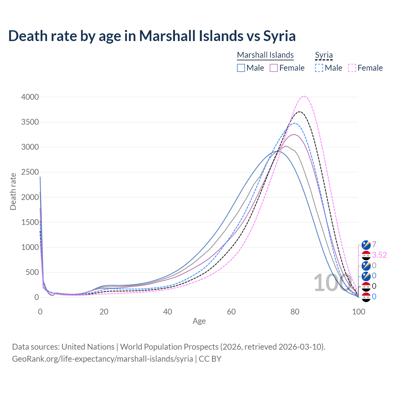 In the Marshall Islands, the most common age of death is 77, compared to 82 in Syria. The median age of death is 72 in the Marshall Islands and 77.7 in Syria, meaning only half of each cohort is expected to live past that age.
