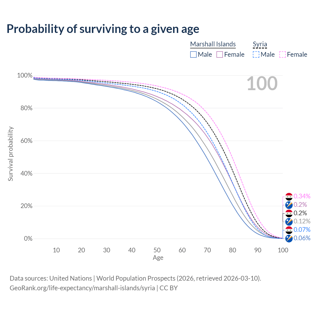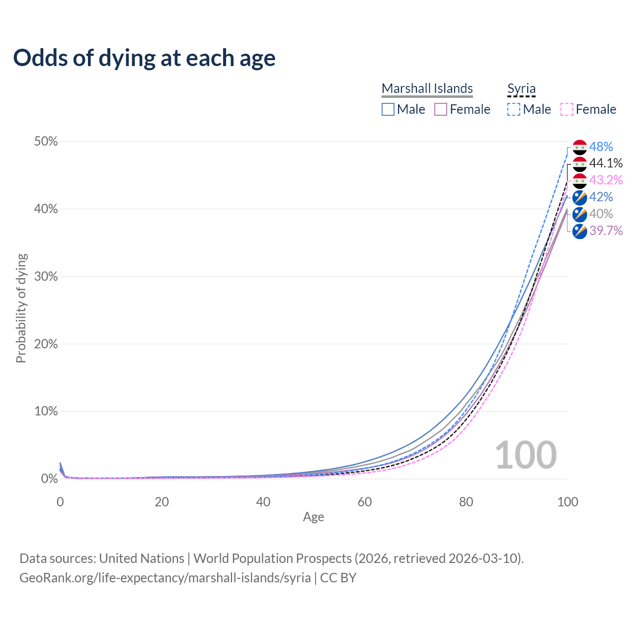 This life expectancy calculator shows the odds of living to 100, 95, 90, and below based on current age for both males and females in the Marshall Islands and Syria, along with mean and median age of death. The calculations are based on the 2026 life tables (actuarial tables) from the UN World Population Prospects.