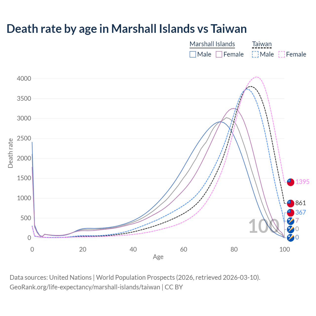 In the Marshall Islands, the most common age of death is 77, compared to 87 in Taiwan. The median age of death is 72 in the Marshall Islands and 84.3 in Taiwan, meaning only half of each cohort is expected to live past that age.