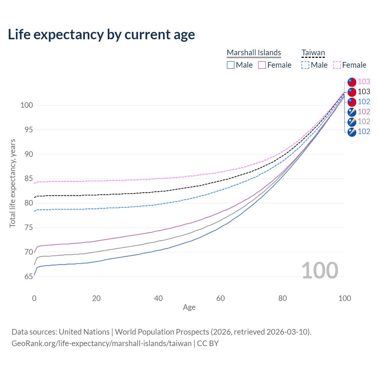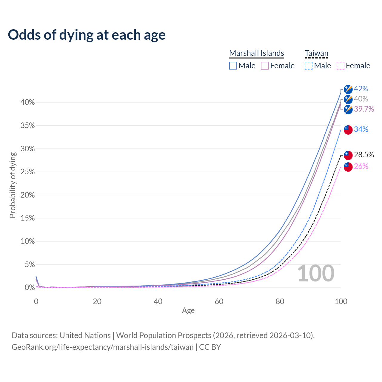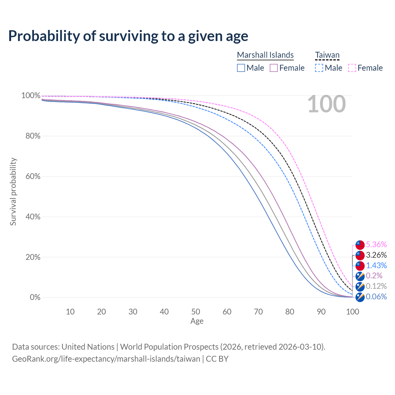 This life expectancy calculator shows the odds of living to 100, 95, 90, and below based on current age for both males and females in the Marshall Islands and Taiwan, along with mean and median age of death. The calculations are based on the 2026 life tables (actuarial tables) from the UN World Population Prospects.