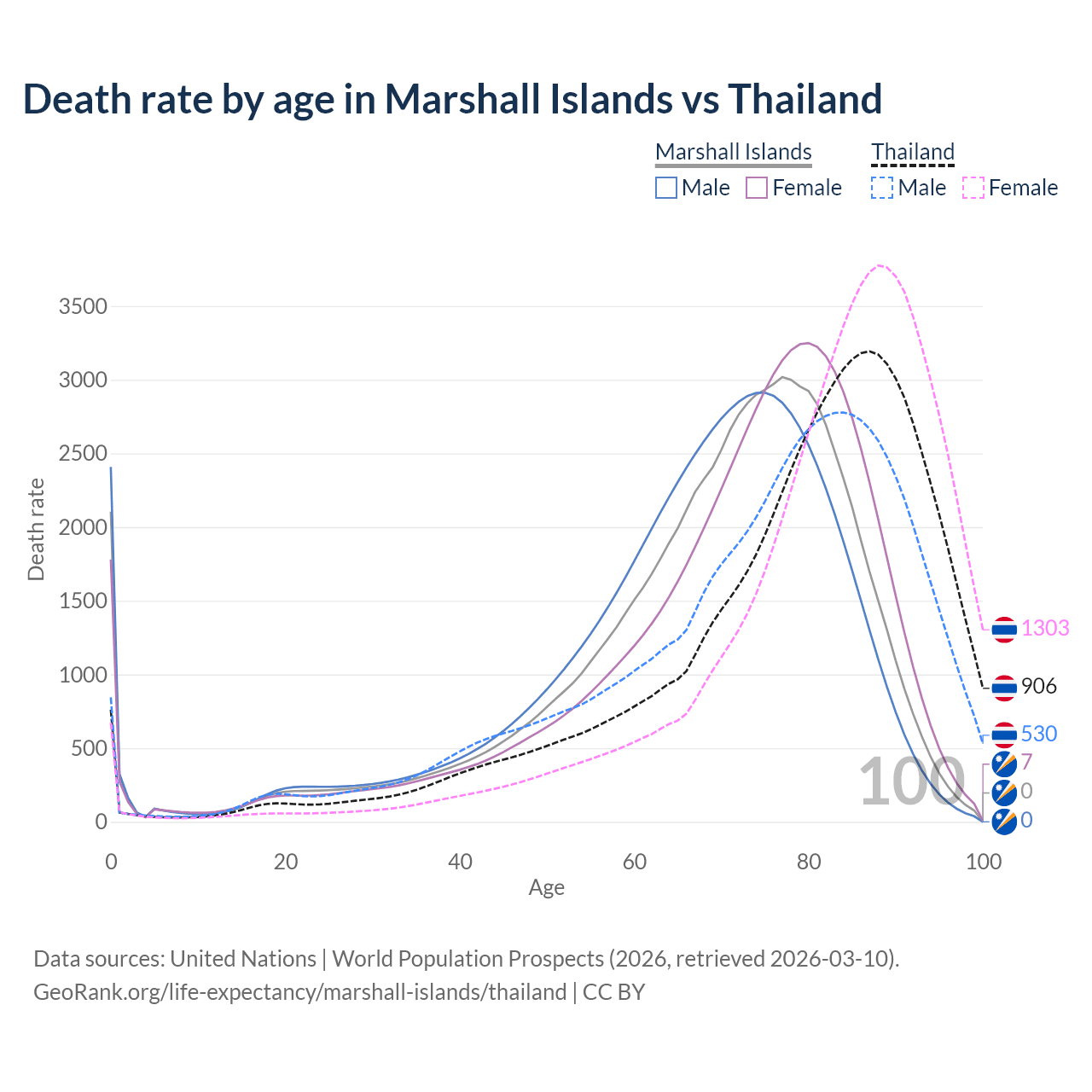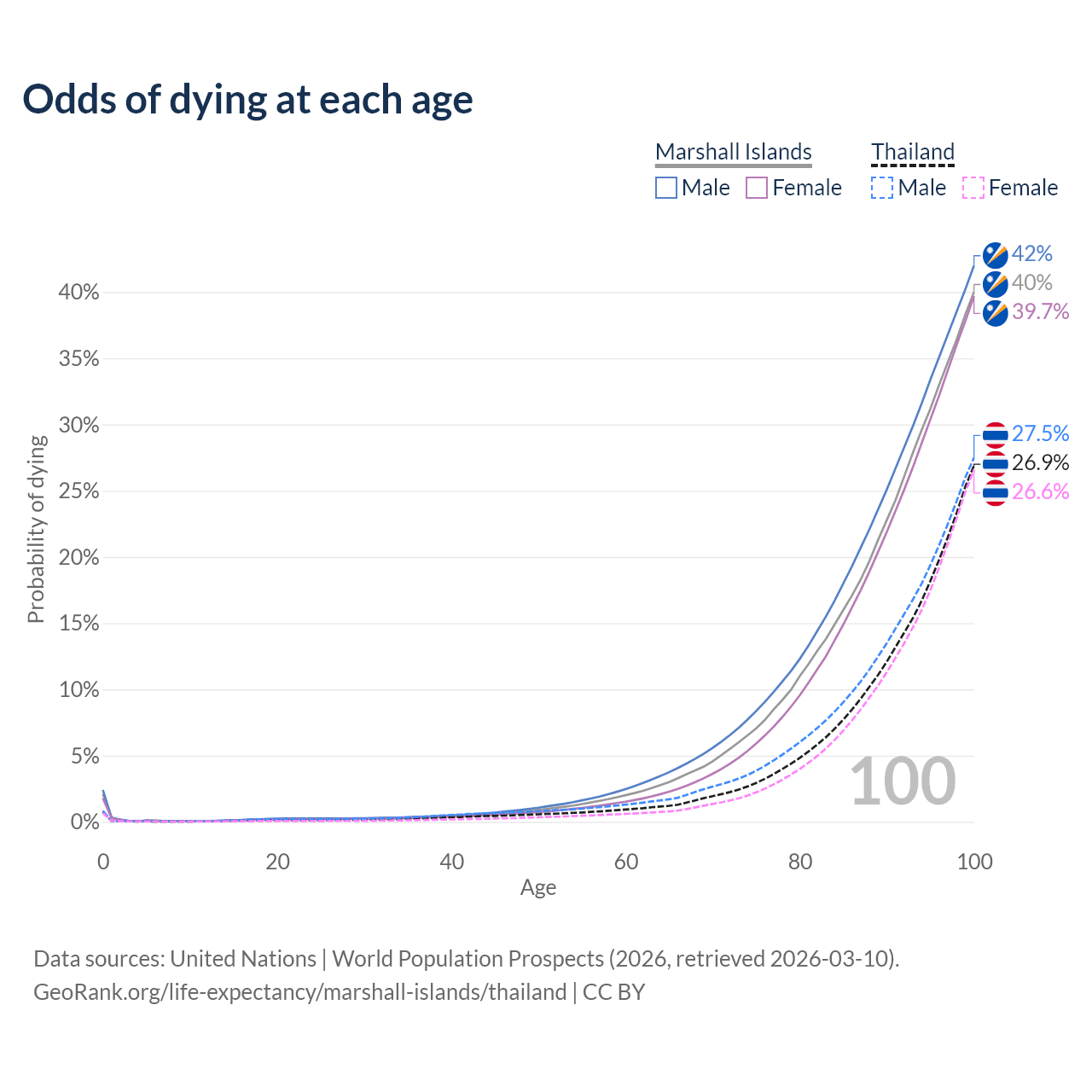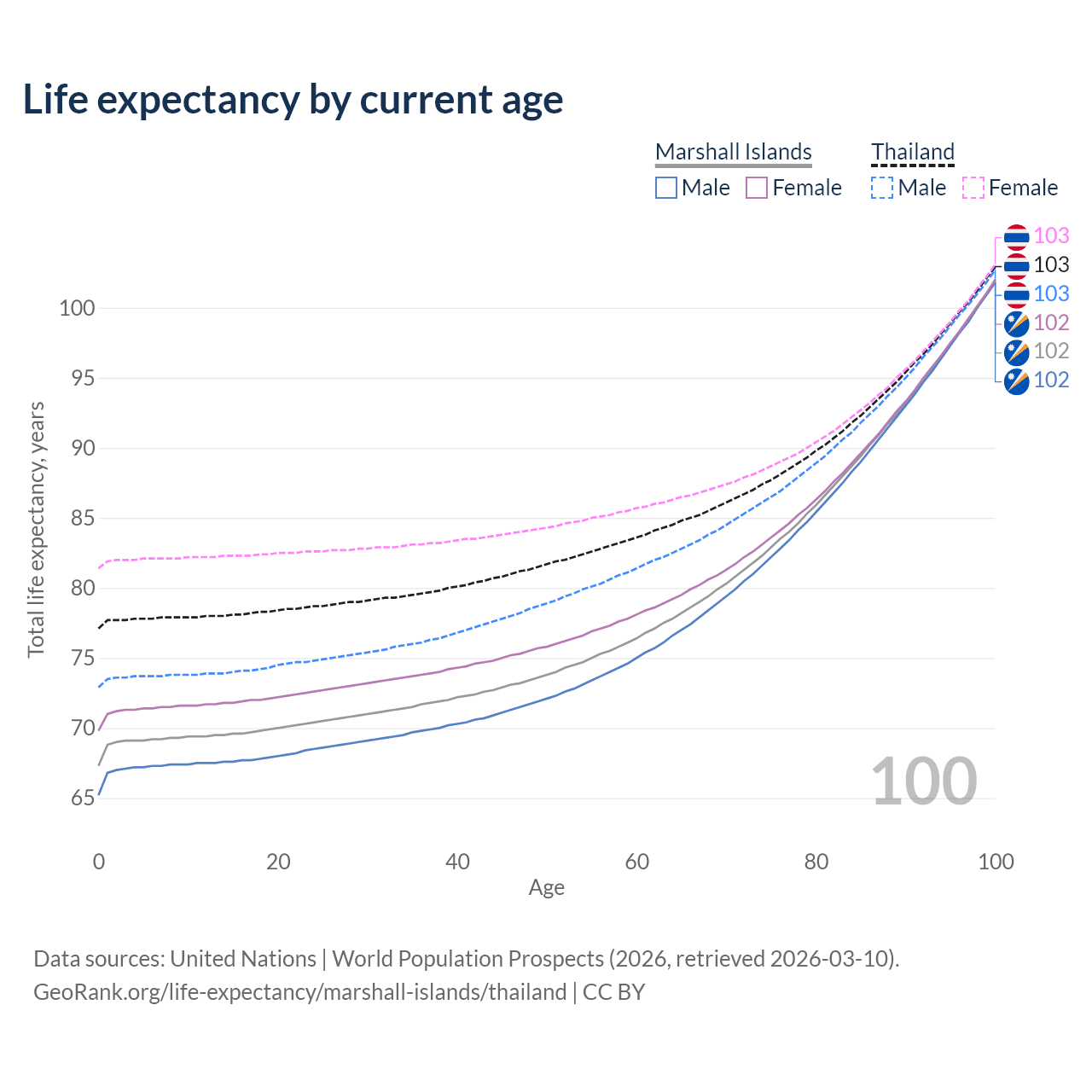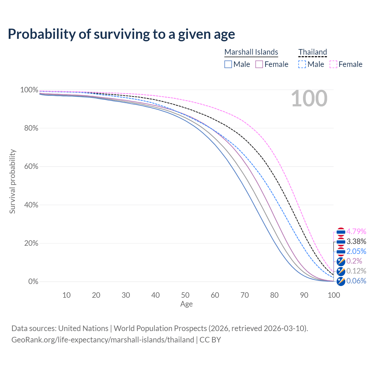 This life expectancy calculator shows the odds of living to 100, 95, 90, and below based on current age for both males and females in the Marshall Islands and Thailand, along with mean and median age of death. The calculations are based on the 2026 life tables (actuarial tables) from the UN World Population Prospects.