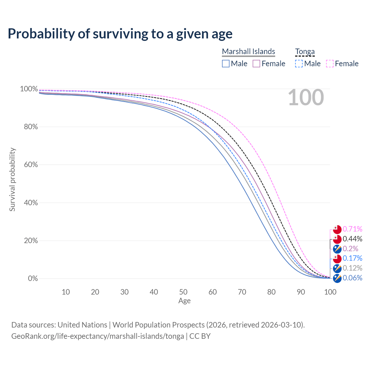 This life expectancy calculator shows the odds of living to 100, 95, 90, and below based on current age for both males and females in the Marshall Islands and Tonga, along with mean and median age of death. The calculations are based on the 2026 life tables (actuarial tables) from the UN World Population Prospects.