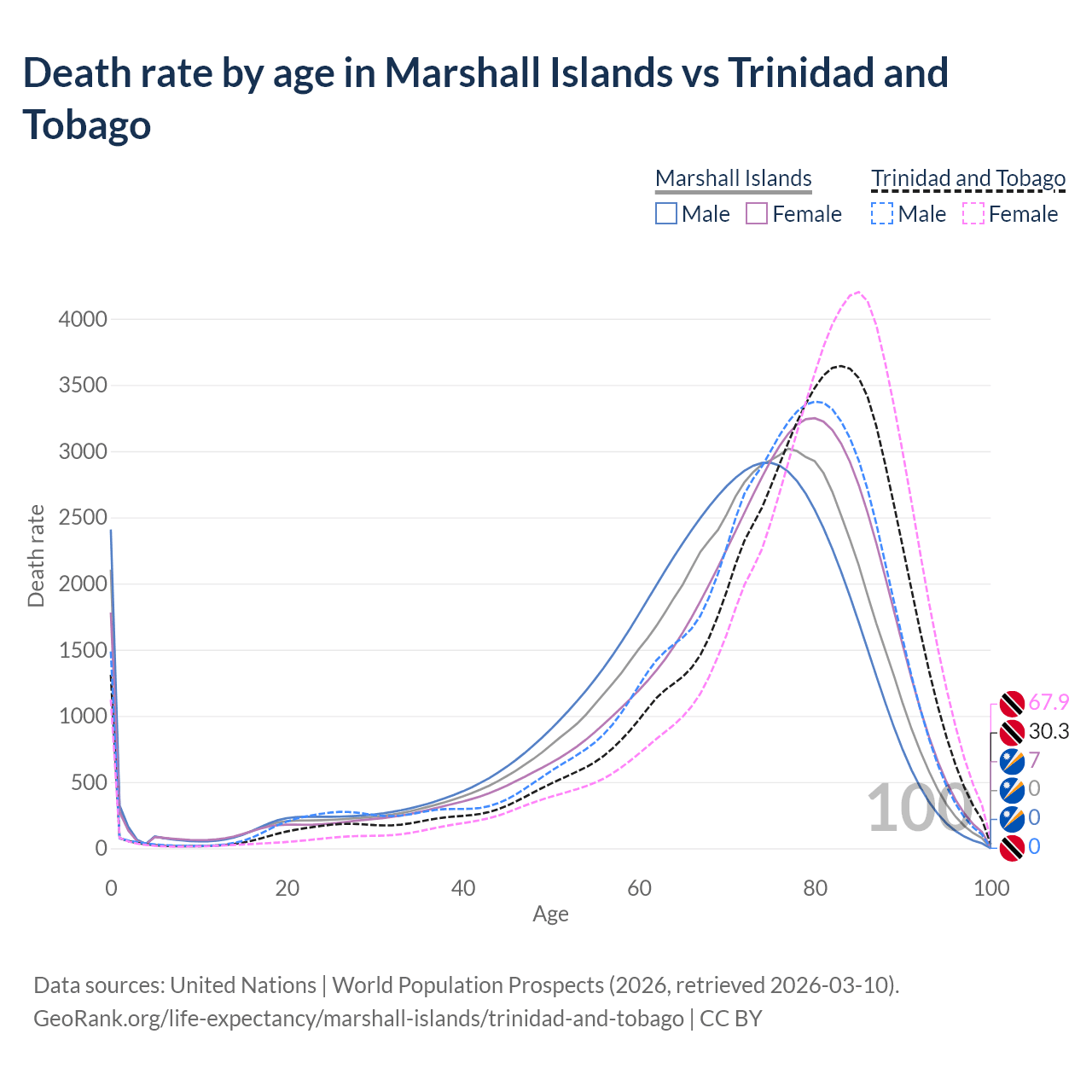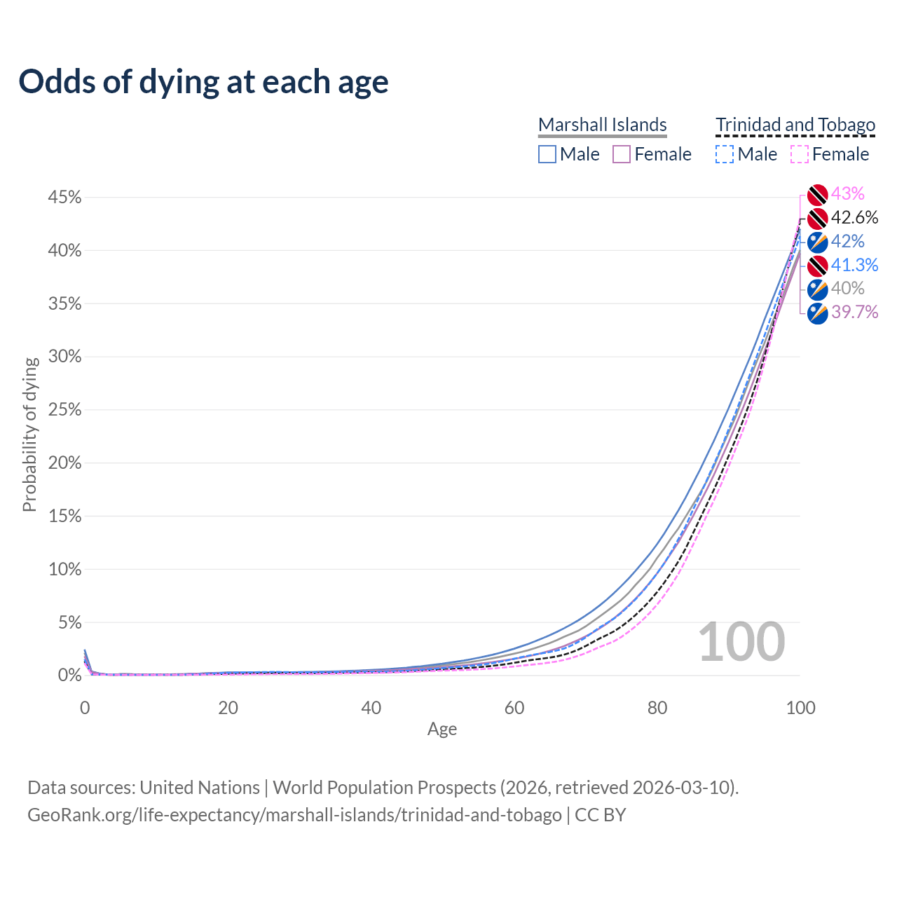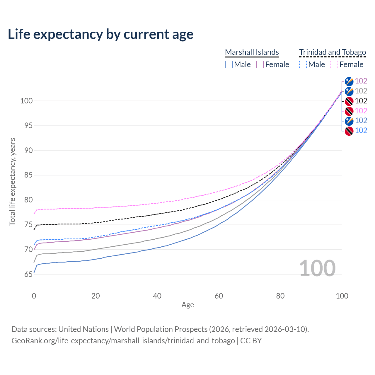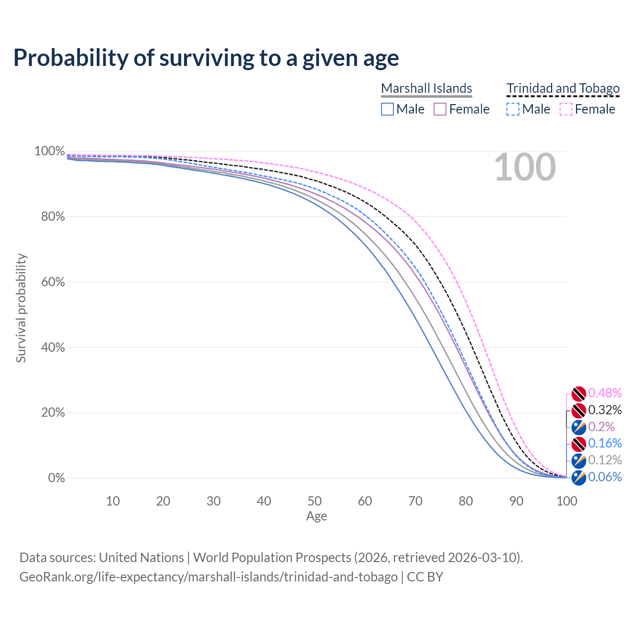 This life expectancy calculator shows the odds of living to 100, 95, 90, and below based on current age for both males and females in the Marshall Islands and Trinidad and Tobago, along with mean and median age of death. The calculations are based on the 2026 life tables (actuarial tables) from the UN World Population Prospects.