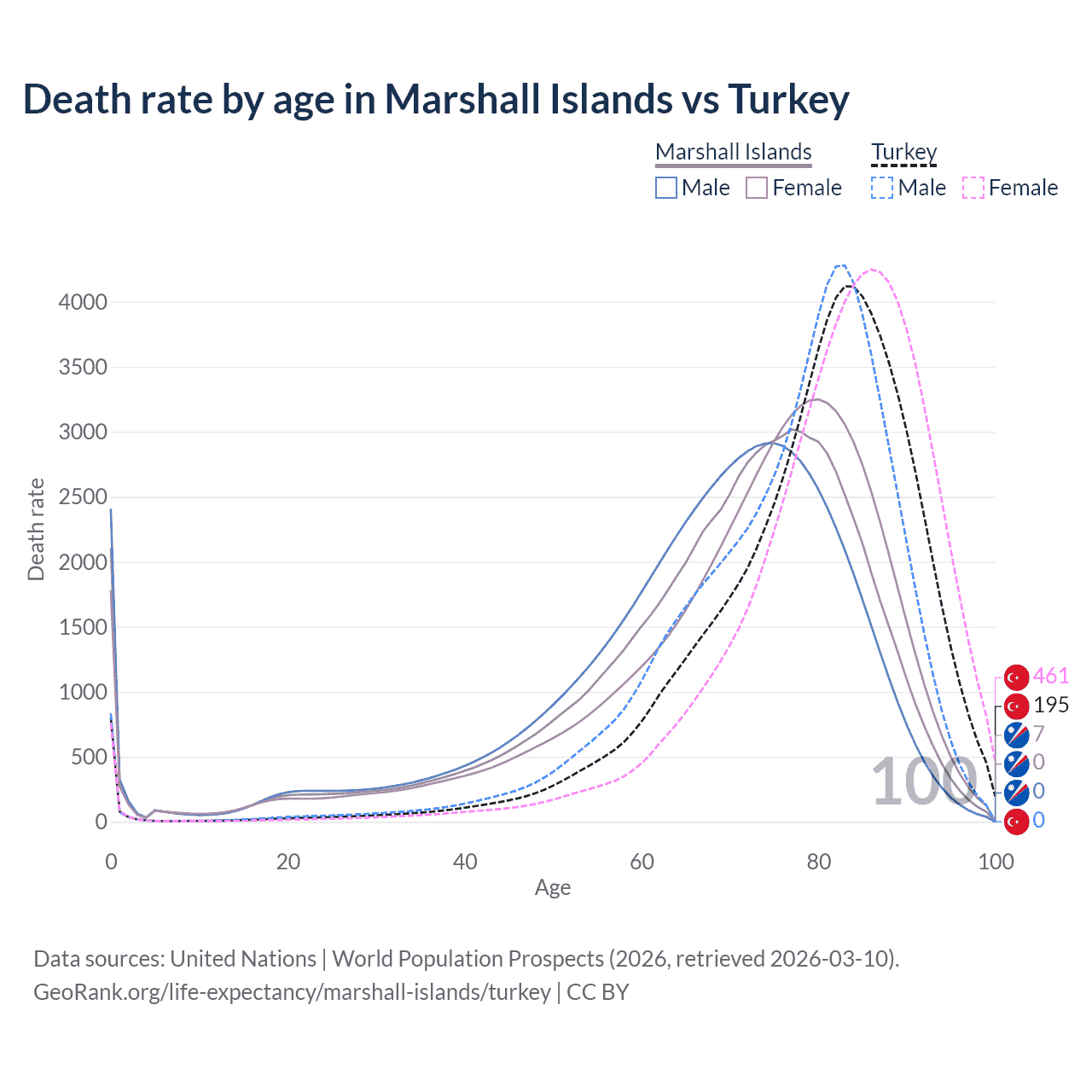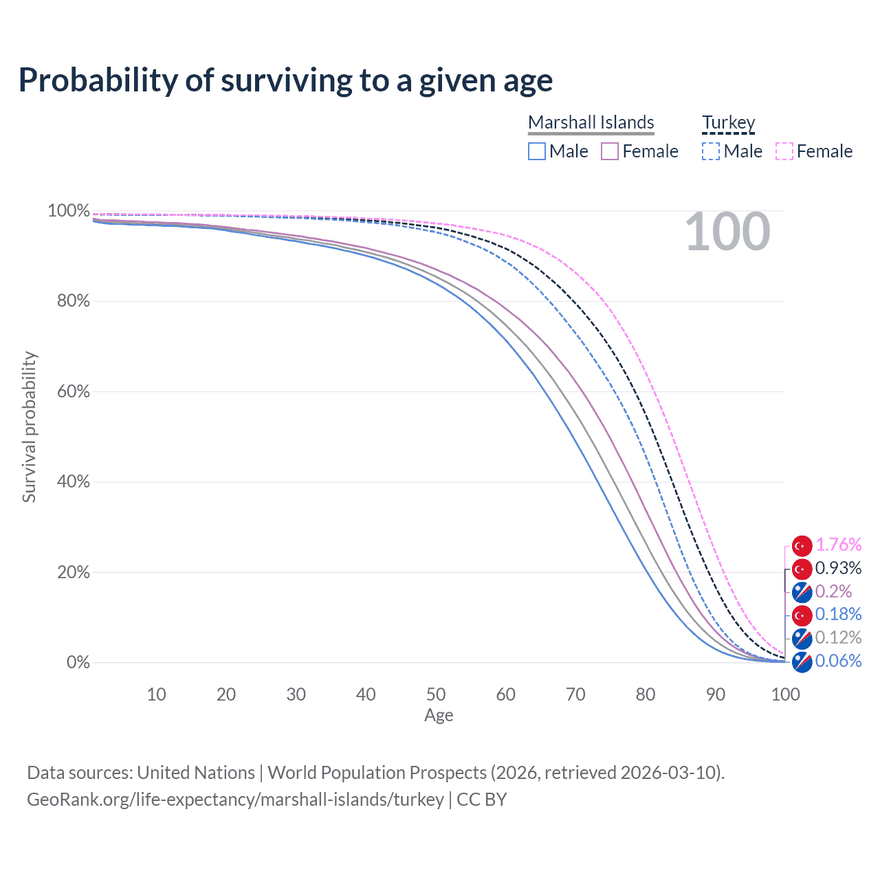 This life expectancy calculator shows the odds of living to 100, 95, 90, and below based on current age for both males and females in the Marshall Islands and Turkey, along with mean and median age of death. The calculations are based on the 2026 life tables (actuarial tables) from the UN World Population Prospects.