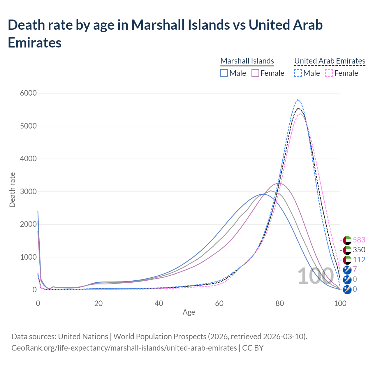 In the Marshall Islands, the most common age of death is 77, compared to 86 in the United Arab Emirates. The median age of death is 72 in the Marshall Islands and 85.6 in the United Arab Emirates, meaning only half of each cohort is expected to live past that age.