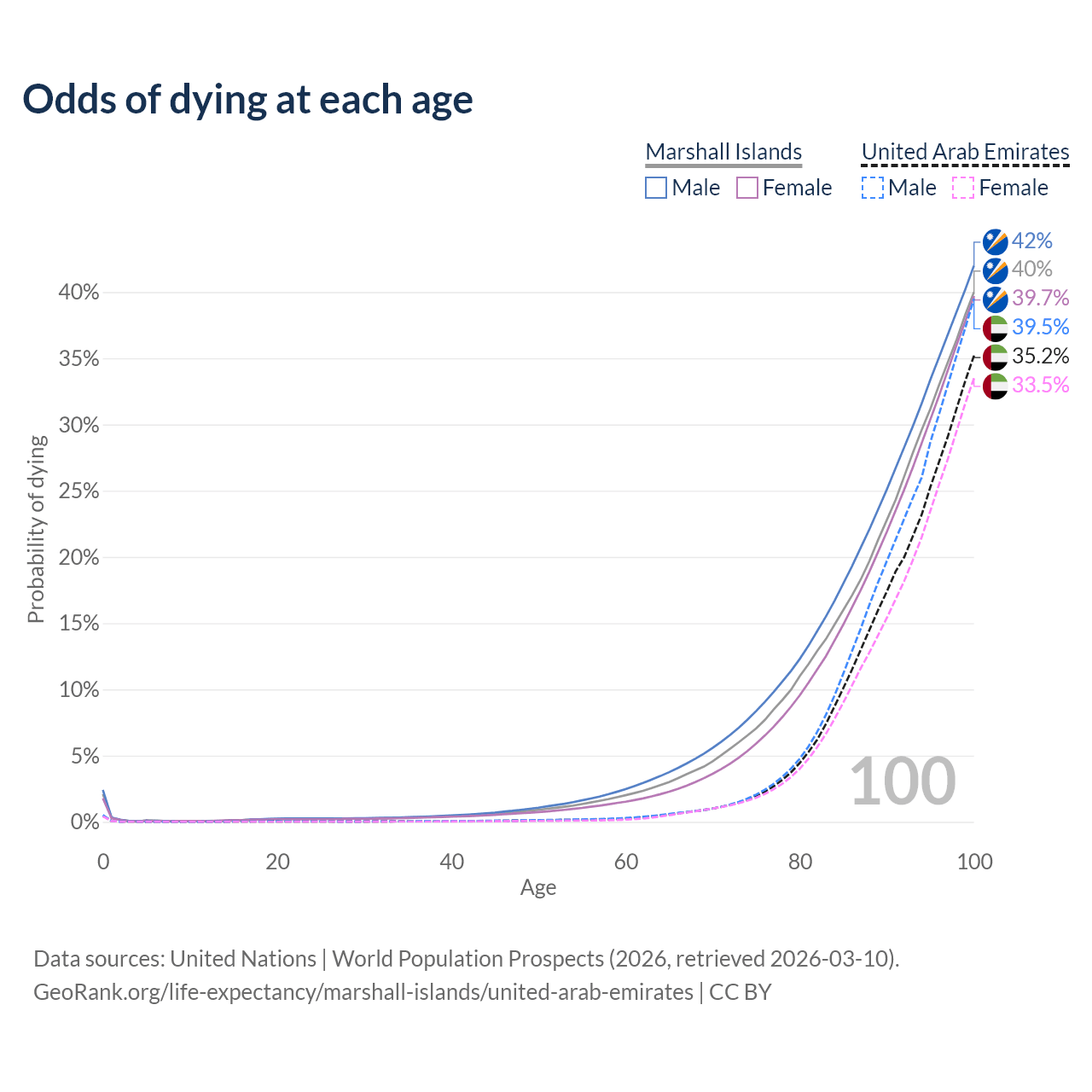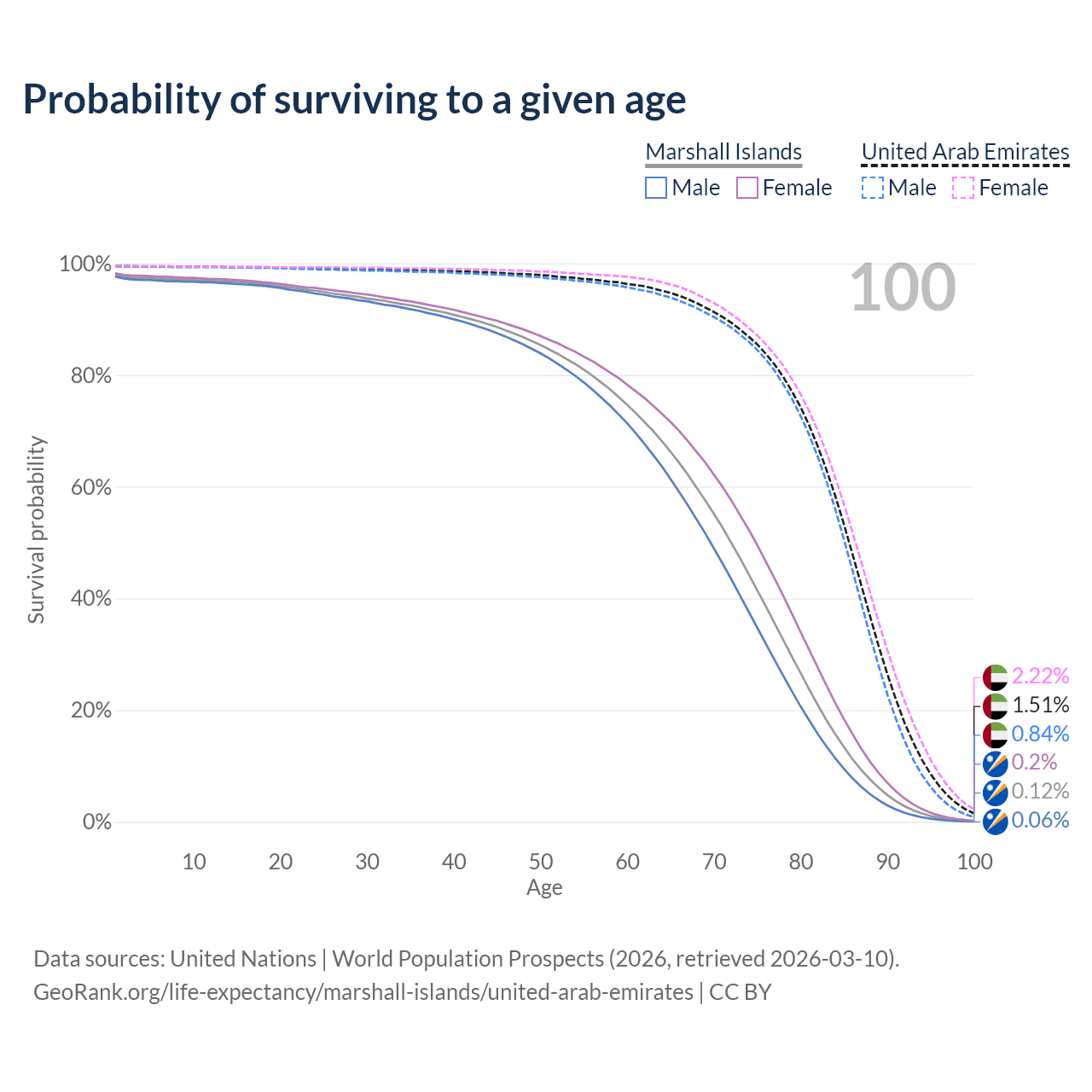 This life expectancy calculator shows the odds of living to 100, 95, 90, and below based on current age for both males and females in the Marshall Islands and the United Arab Emirates, along with mean and median age of death. The calculations are based on the 2026 life tables (actuarial tables) from the UN World Population Prospects.