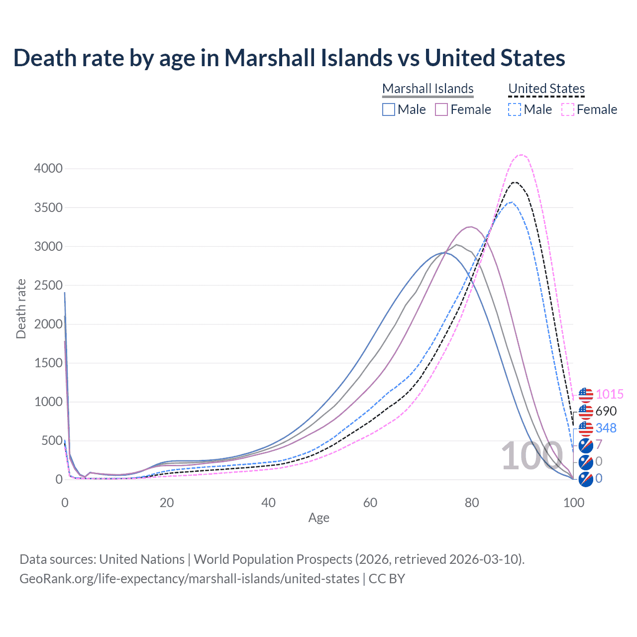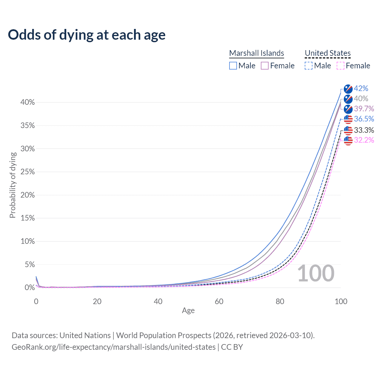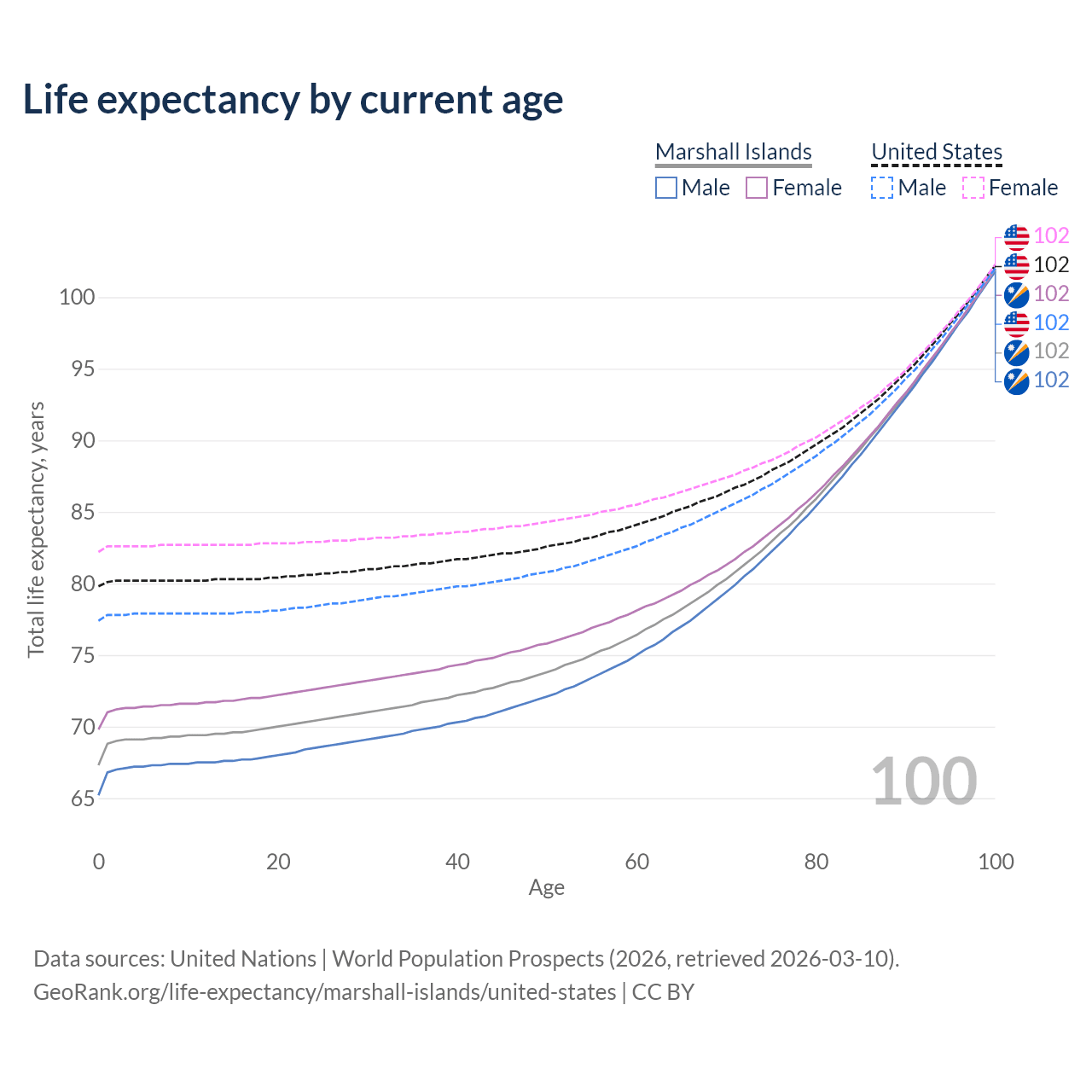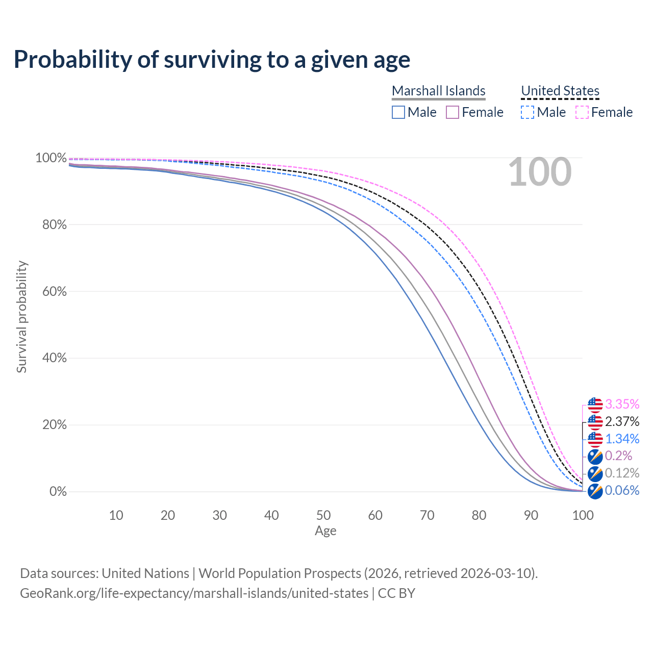 This life expectancy calculator shows the odds of living to 100, 95, 90, and below based on current age for both males and females in the Marshall Islands and the United States, along with mean and median age of death. The calculations are based on the 2026 life tables (actuarial tables) from the UN World Population Prospects.