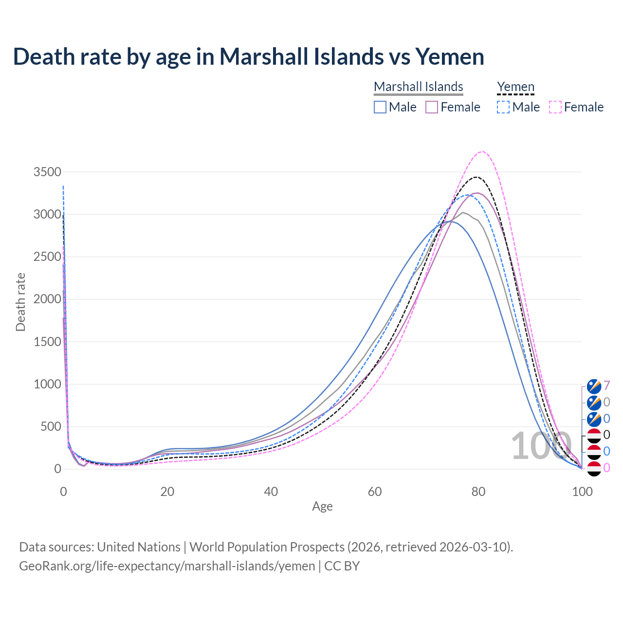 In the Marshall Islands, the most common age of death is 77, compared to 80 in Yemen. The median age of death is 72 in the Marshall Islands and 74.9 in Yemen, meaning only half of each cohort is expected to live past that age.