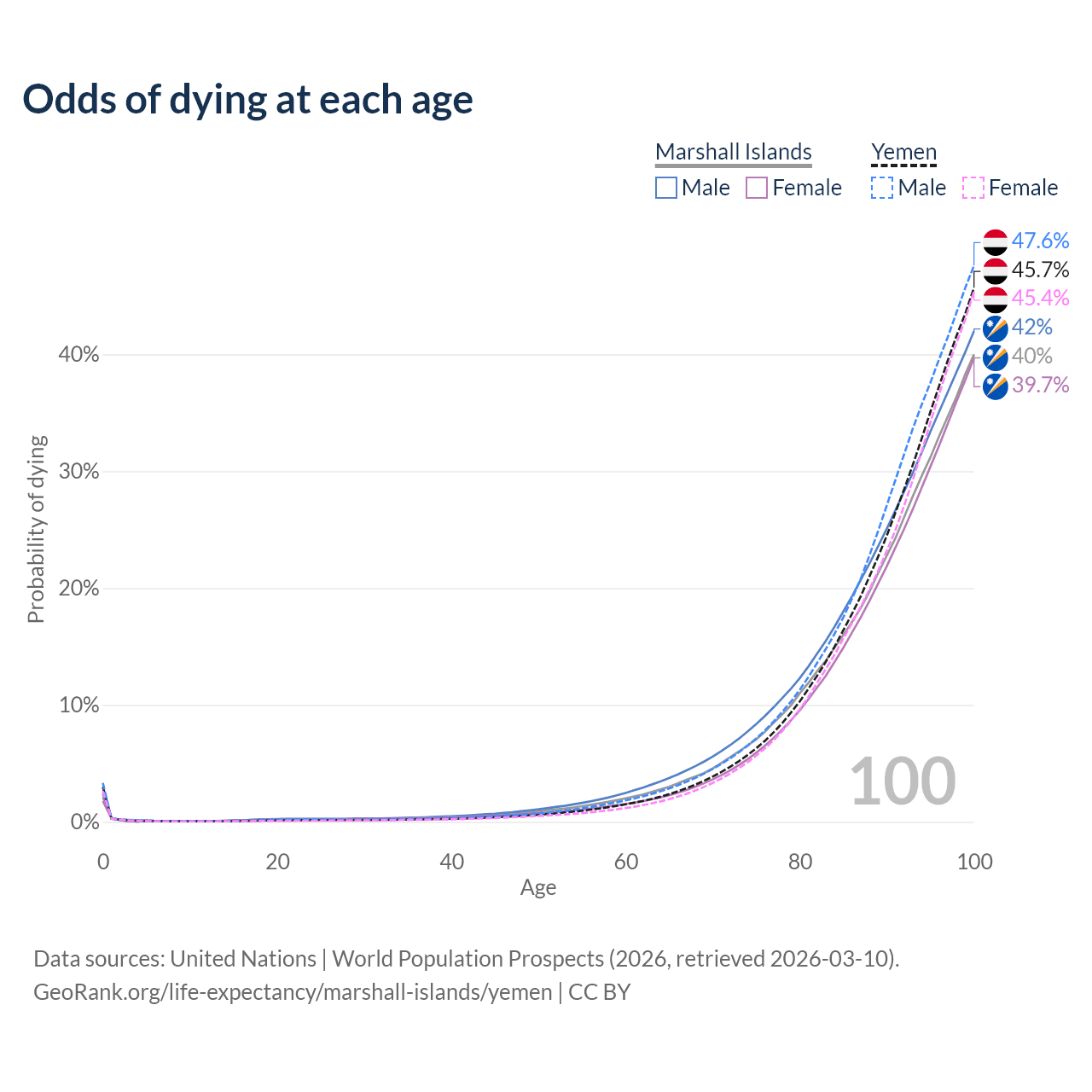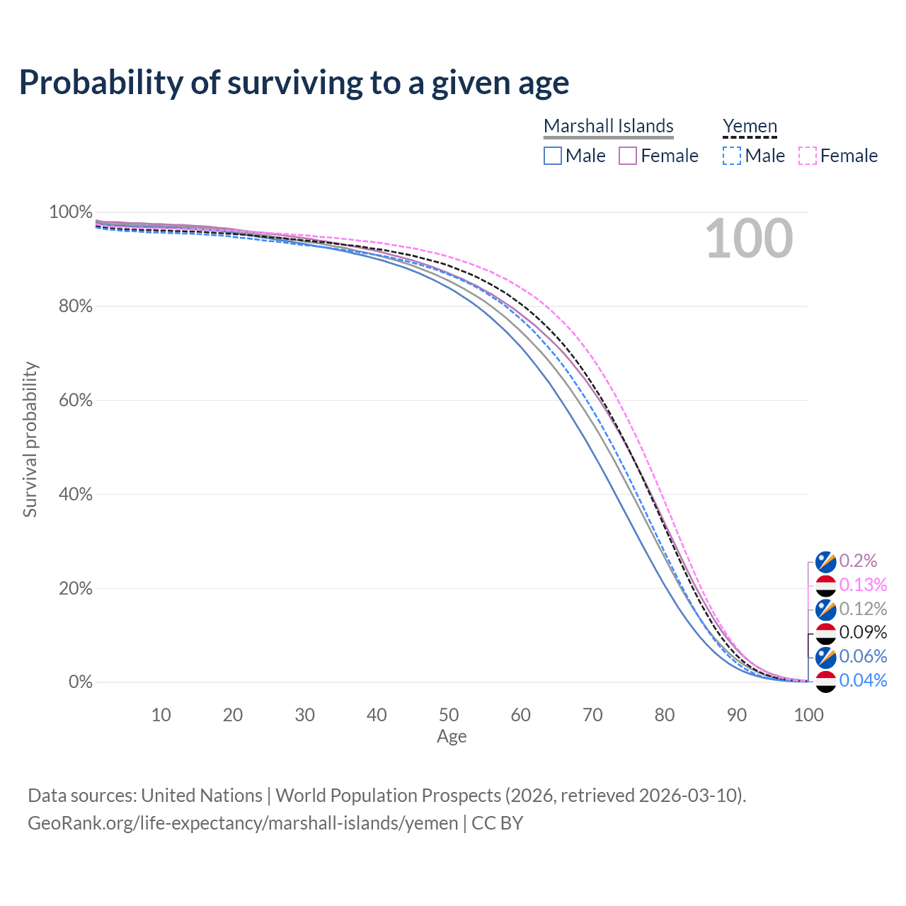 This life expectancy calculator shows the odds of living to 100, 95, 90, and below based on current age for both males and females in the Marshall Islands and Yemen, along with mean and median age of death. The calculations are based on the 2026 life tables (actuarial tables) from the UN World Population Prospects.