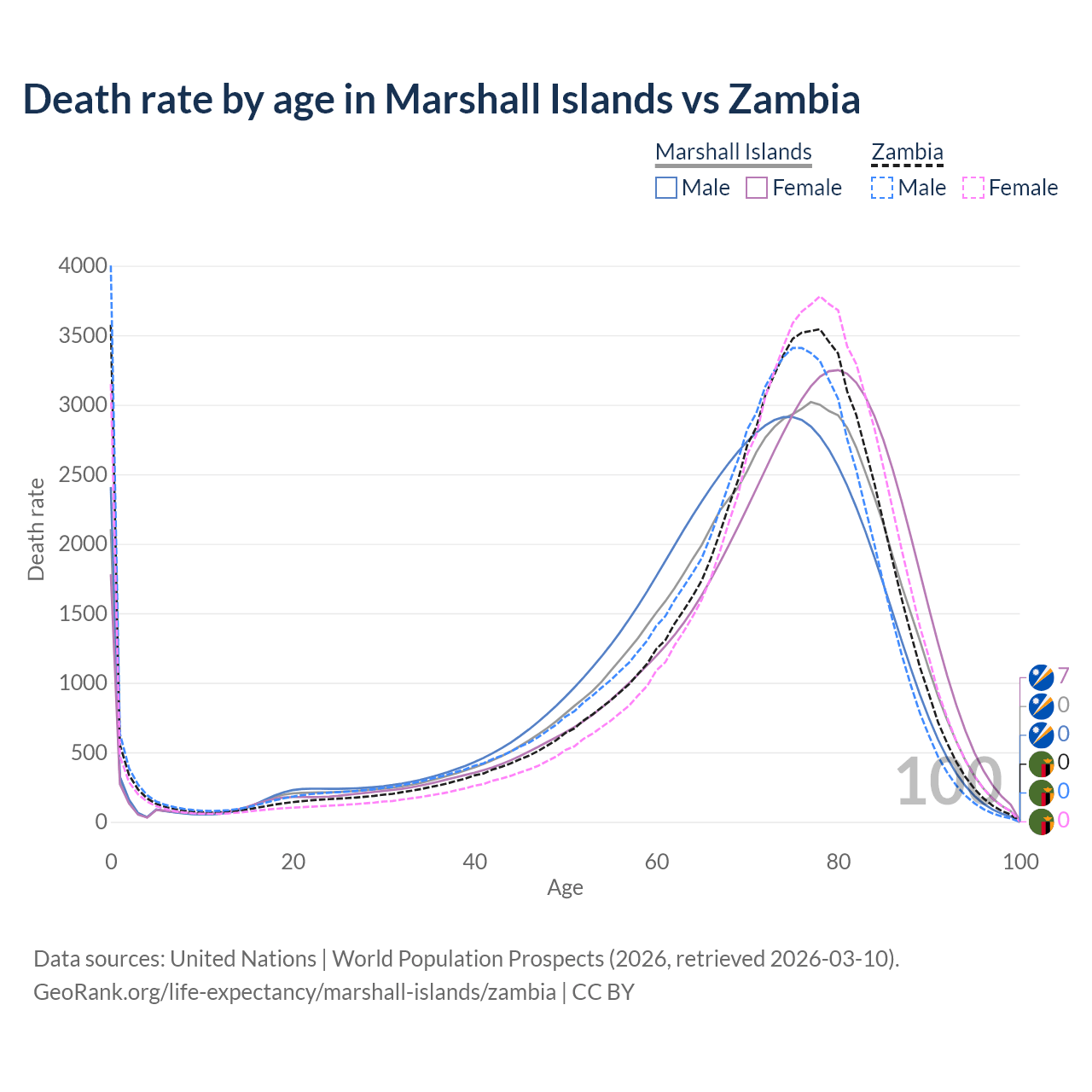 In the Marshall Islands, the most common age of death is 77, compared to 0 in Zambia. The median age of death is 72 in the Marshall Islands and 73.1 in Zambia, meaning only half of each cohort is expected to live past that age.