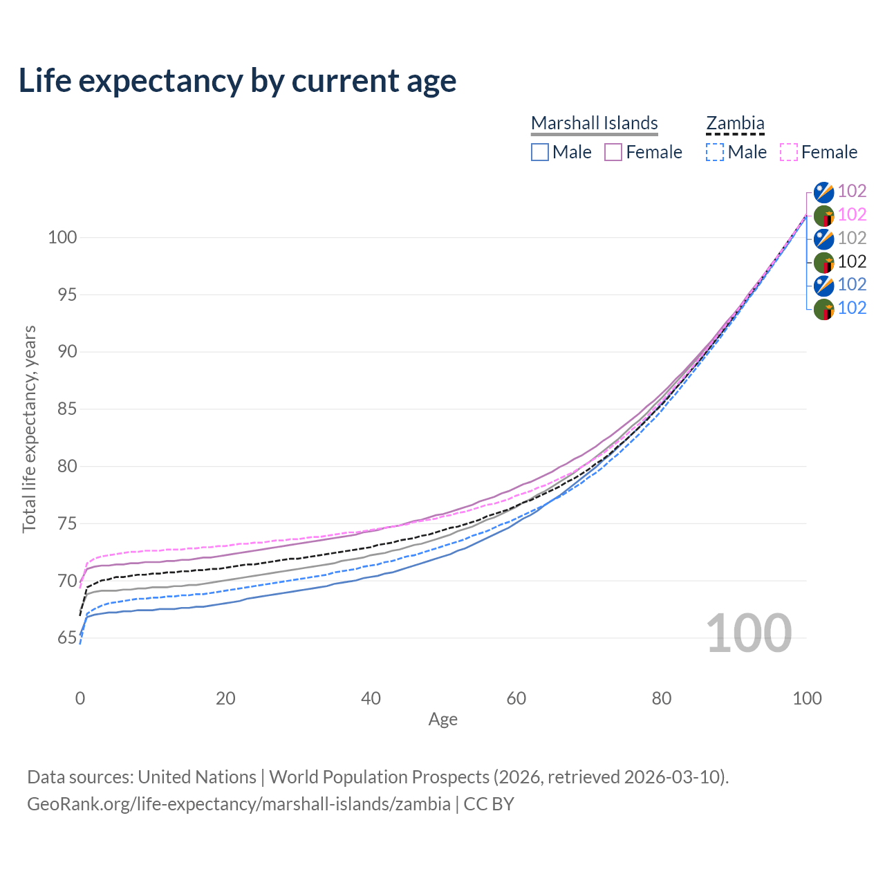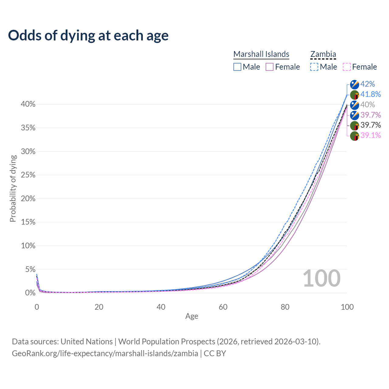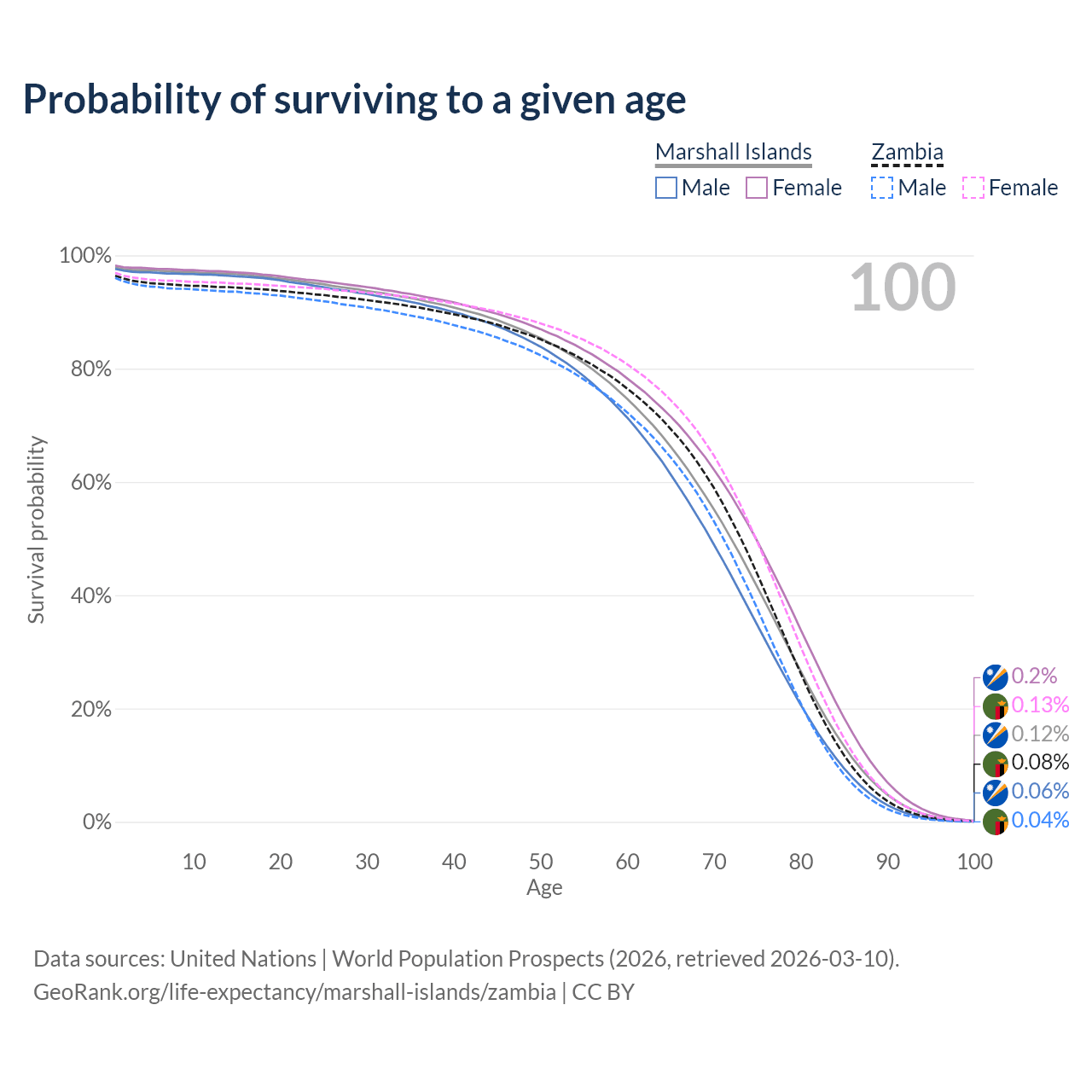 This life expectancy calculator shows the odds of living to 100, 95, 90, and below based on current age for both males and females in the Marshall Islands and Zambia, along with mean and median age of death. The calculations are based on the 2026 life tables (actuarial tables) from the UN World Population Prospects.
