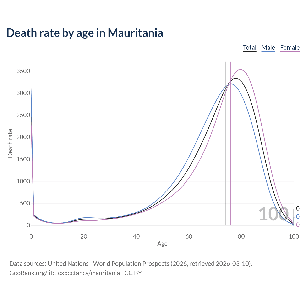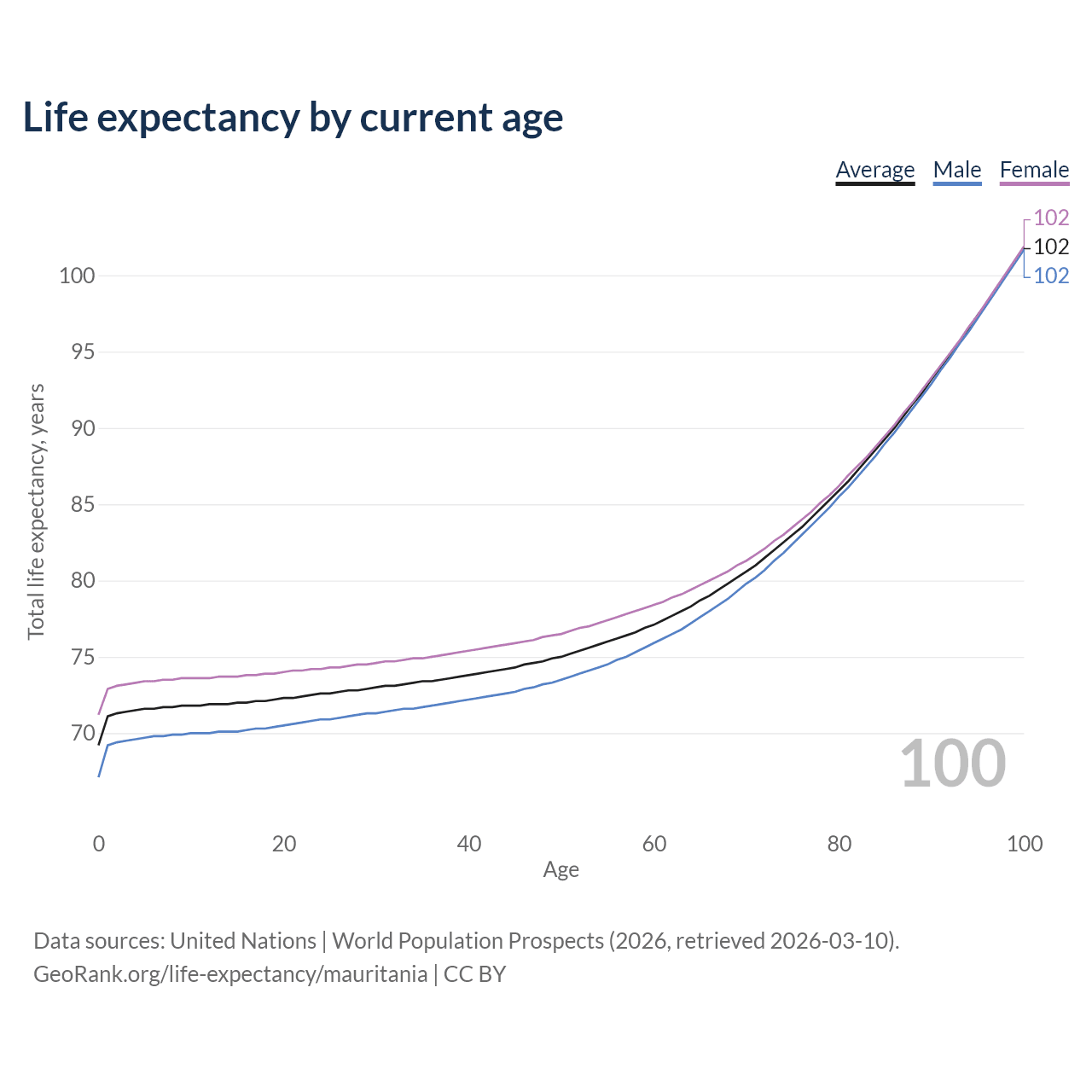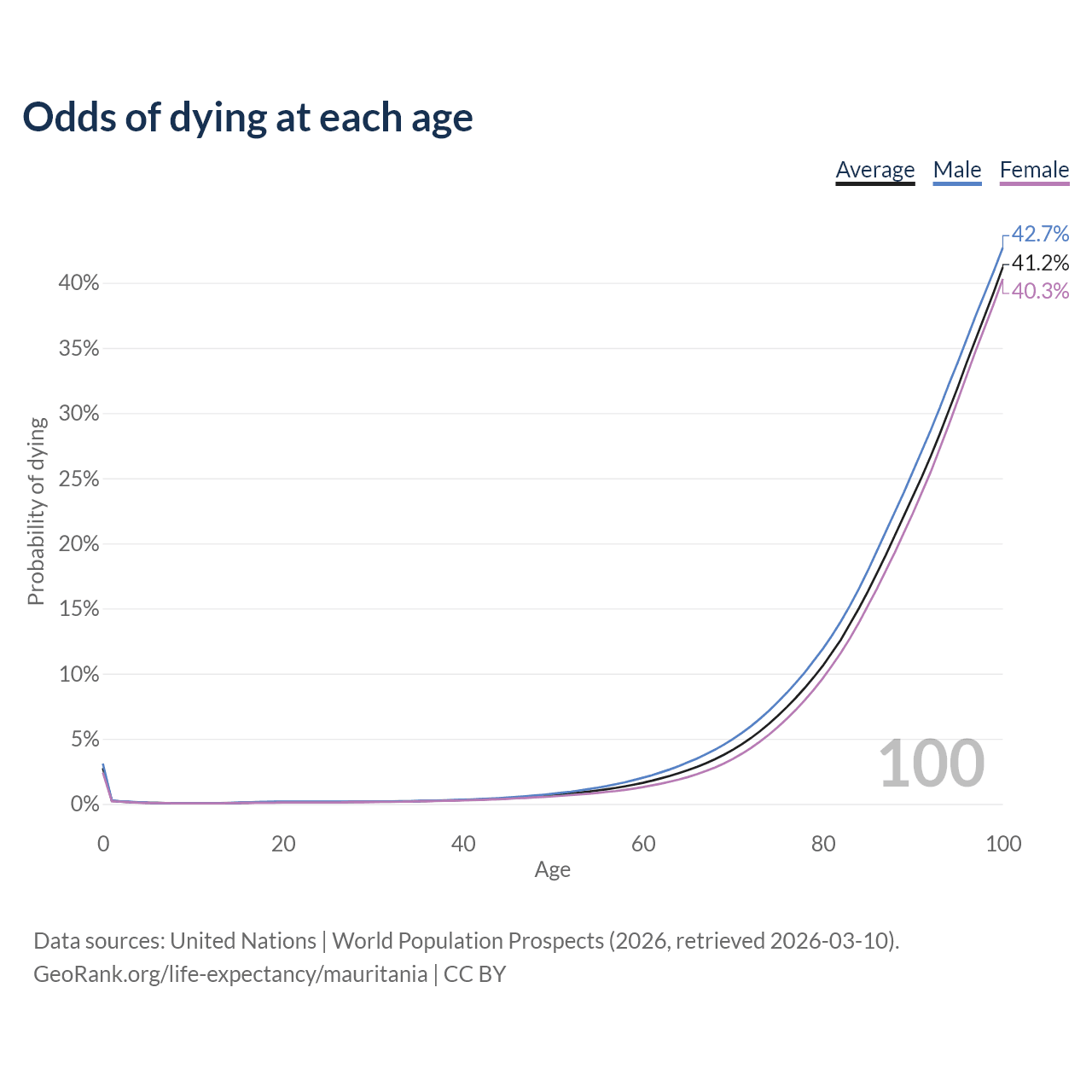 This life expectancy calculator shows the odds of living to 100, 95, 90, and below based on current age for both males and females in Mauritania, along with mean and median age of death. The calculations are based on the 2026 life tables (actuarial tables) from the UN World Population Prospects.