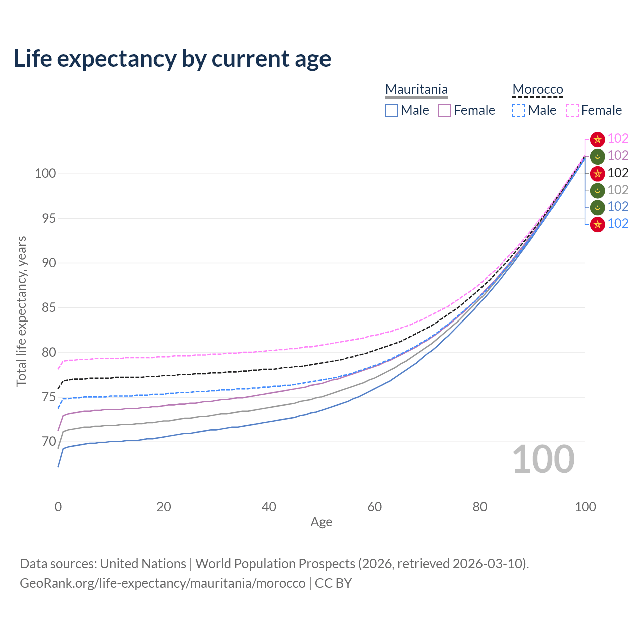 This life expectancy calculator shows the odds of living to 100, 95, 90, and below based on current age for both males and females in Mauritania and Morocco, along with mean and median age of death. The calculations are based on the 2026 life tables (actuarial tables) from the UN World Population Prospects.