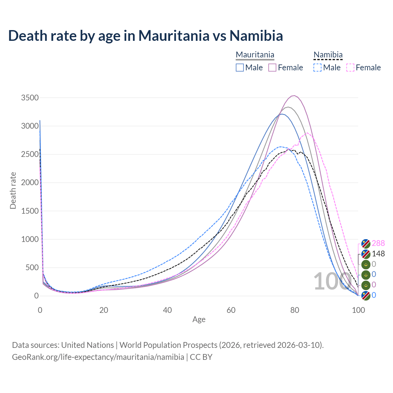 In Mauritania, the most common age of death is 78, compared to 0 in Namibia. The median age of death is 74.1 in Mauritania and 72.7 in Namibia, meaning only half of each cohort is expected to live past that age.