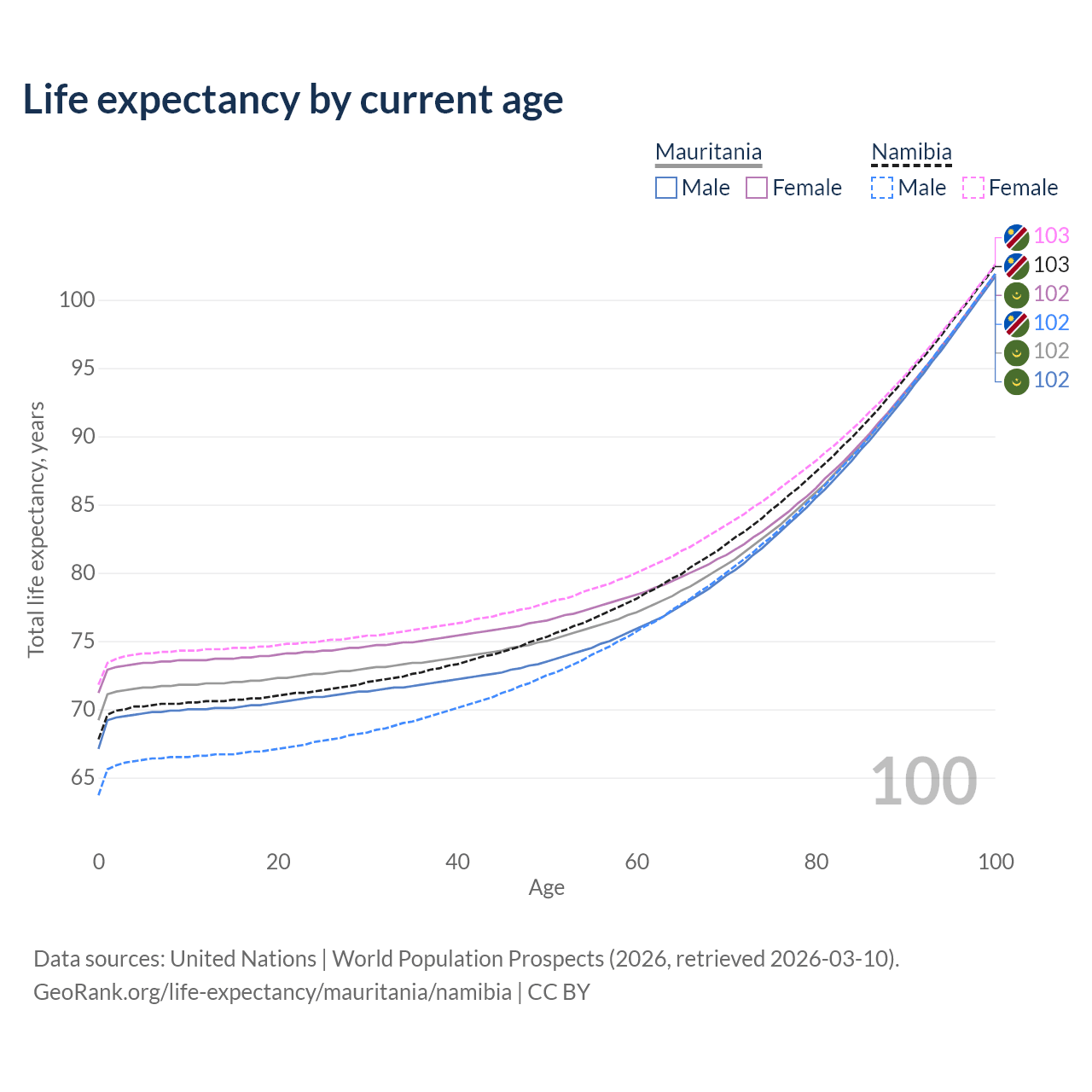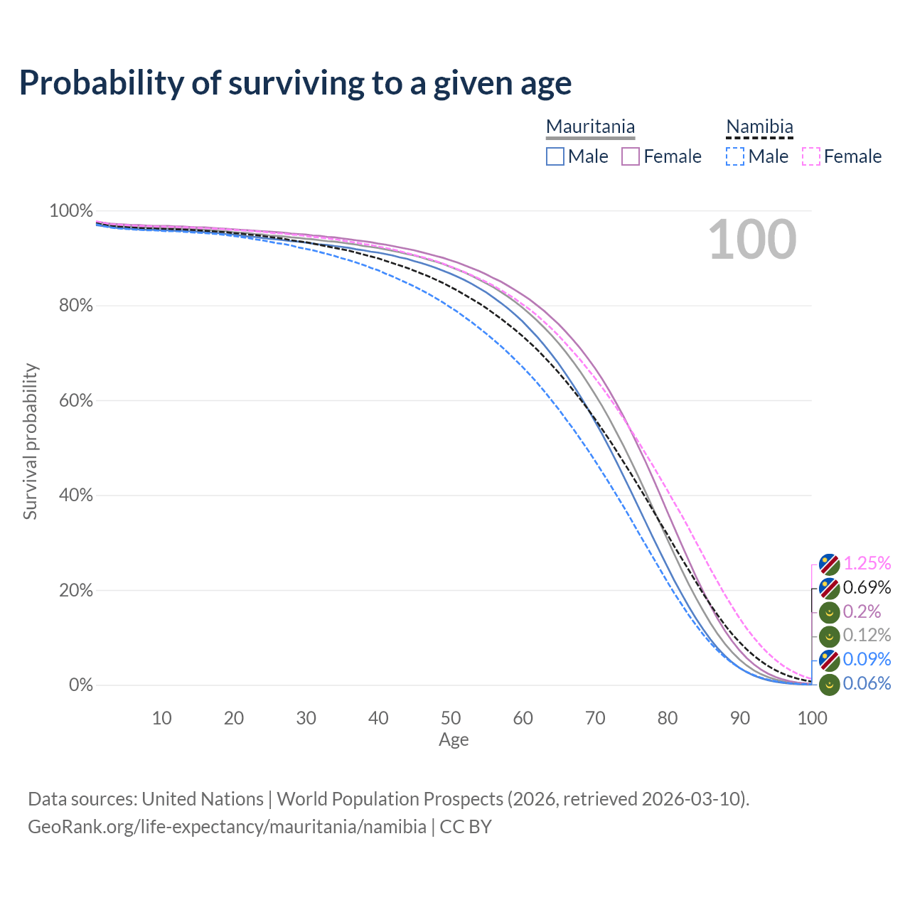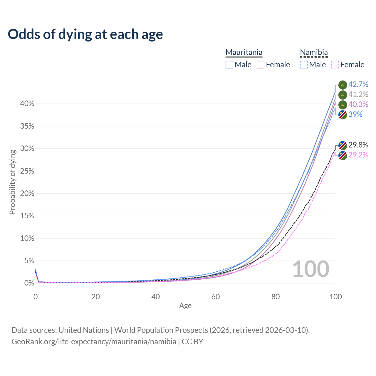 This life expectancy calculator shows the odds of living to 100, 95, 90, and below based on current age for both males and females in Mauritania and Namibia, along with mean and median age of death. The calculations are based on the 2026 life tables (actuarial tables) from the UN World Population Prospects.