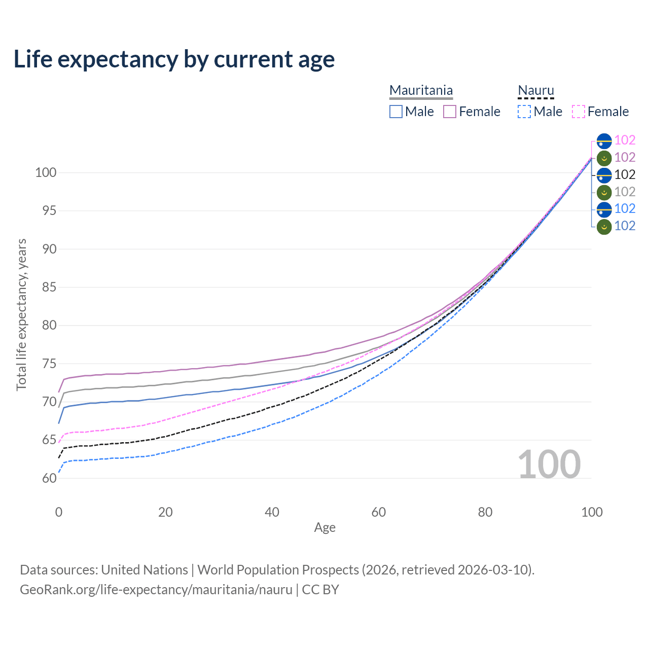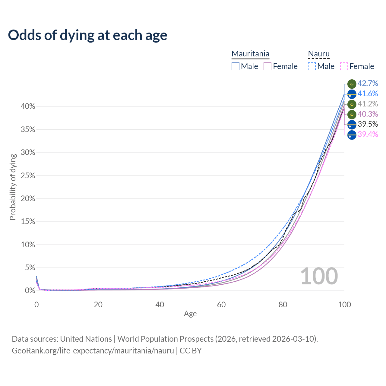 This life expectancy calculator shows the odds of living to 100, 95, 90, and below based on current age for both males and females in Mauritania and Nauru, along with mean and median age of death. The calculations are based on the 2026 life tables (actuarial tables) from the UN World Population Prospects.