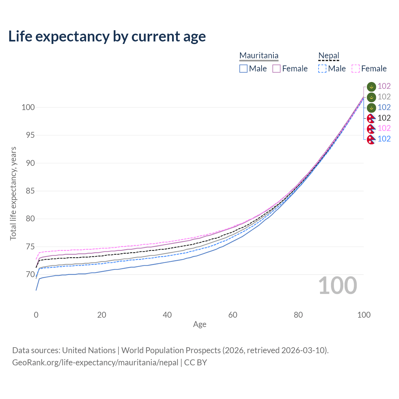 This life expectancy calculator shows the odds of living to 100, 95, 90, and below based on current age for both males and females in Mauritania and Nepal, along with mean and median age of death. The calculations are based on the 2026 life tables (actuarial tables) from the UN World Population Prospects.