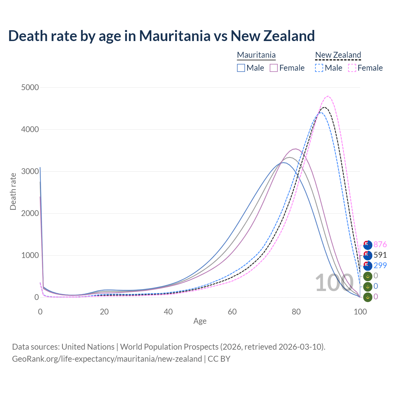 In Mauritania, the most common age of death is 78, compared to 89 in New Zealand. The median age of death is 74.1 in Mauritania and 85.8 in New Zealand, meaning only half of each cohort is expected to live past that age.
