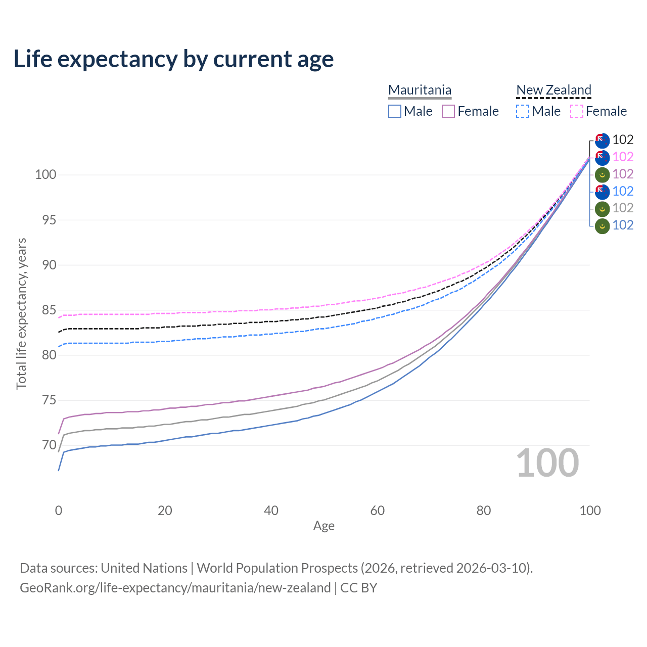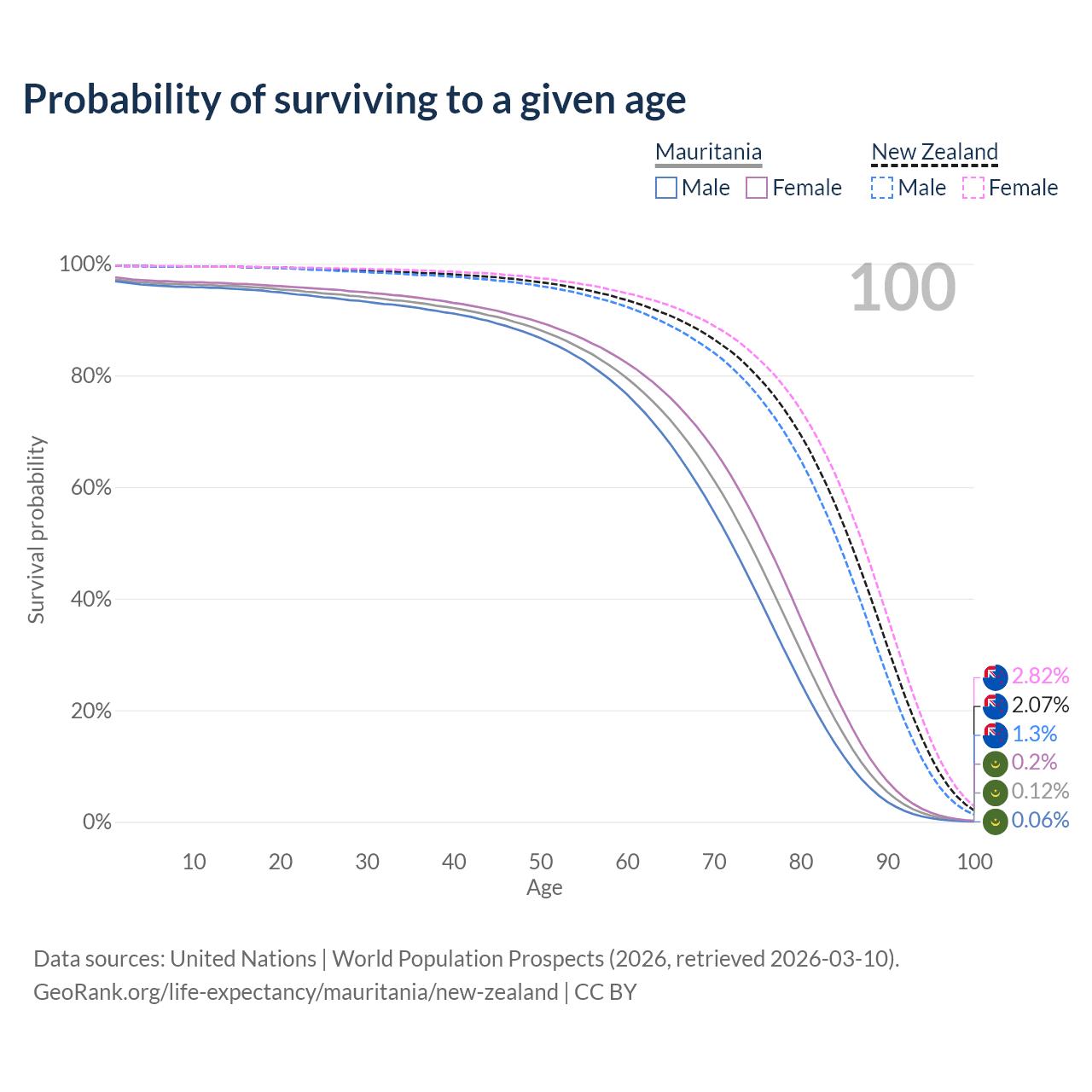 This life expectancy calculator shows the odds of living to 100, 95, 90, and below based on current age for both males and females in Mauritania and New Zealand, along with mean and median age of death. The calculations are based on the 2026 life tables (actuarial tables) from the UN World Population Prospects.