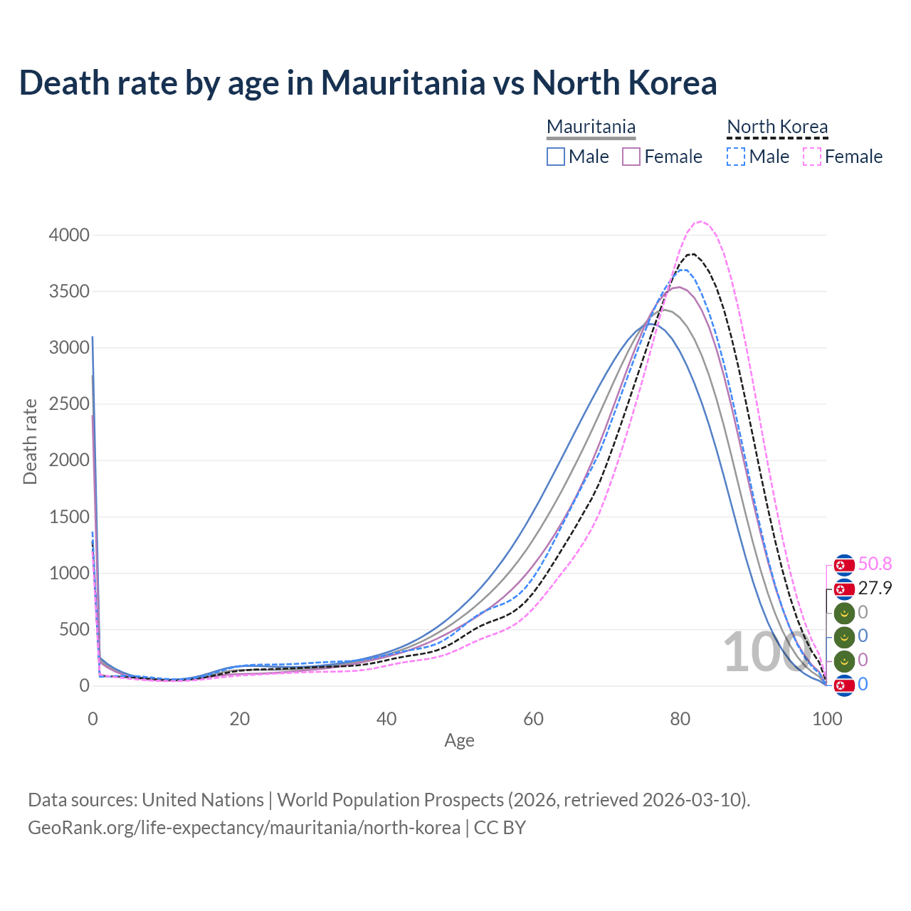 In Mauritania, the most common age of death is 78, compared to 82 in North Korea. The median age of death is 74.1 in Mauritania and 78.5 in North Korea, meaning only half of each cohort is expected to live past that age.