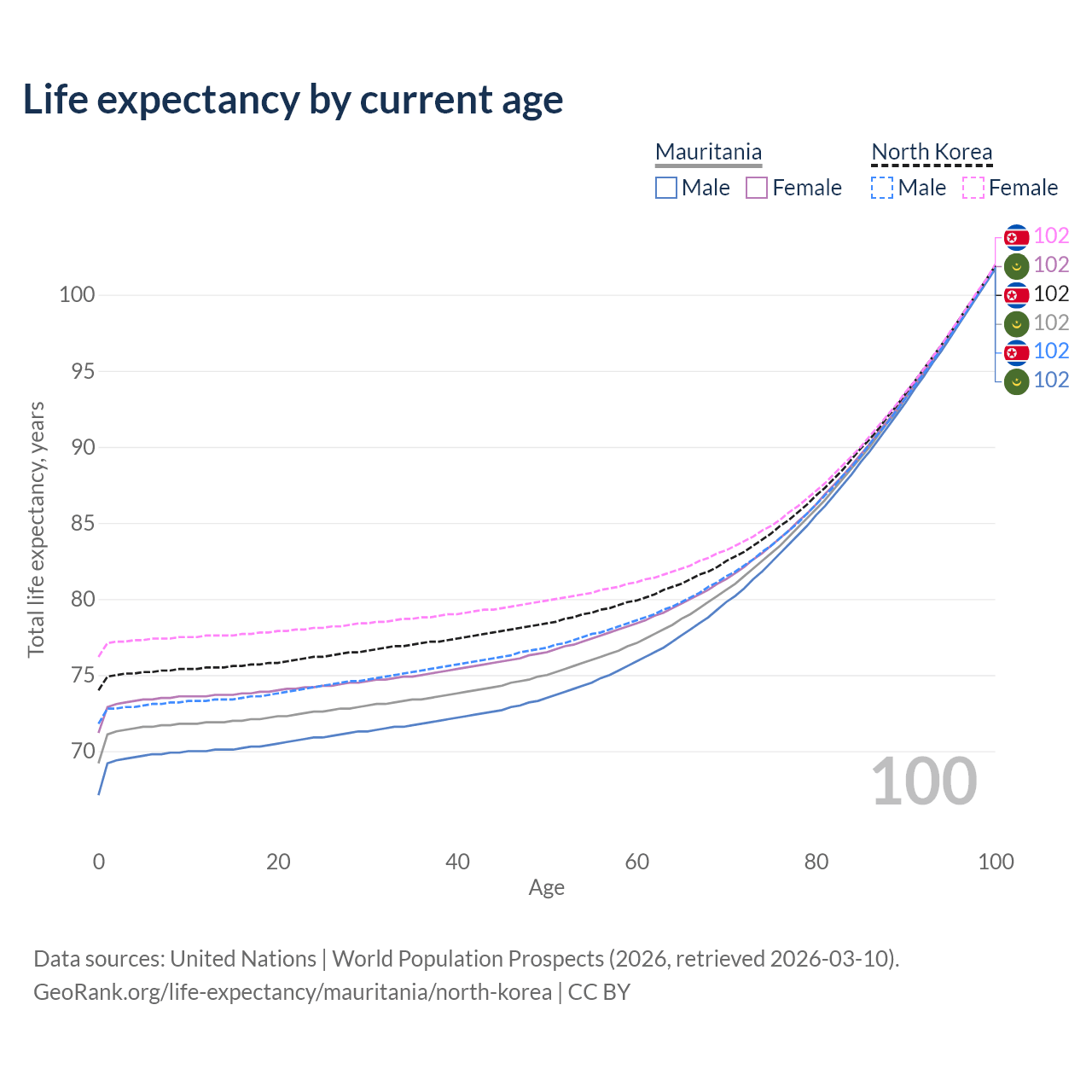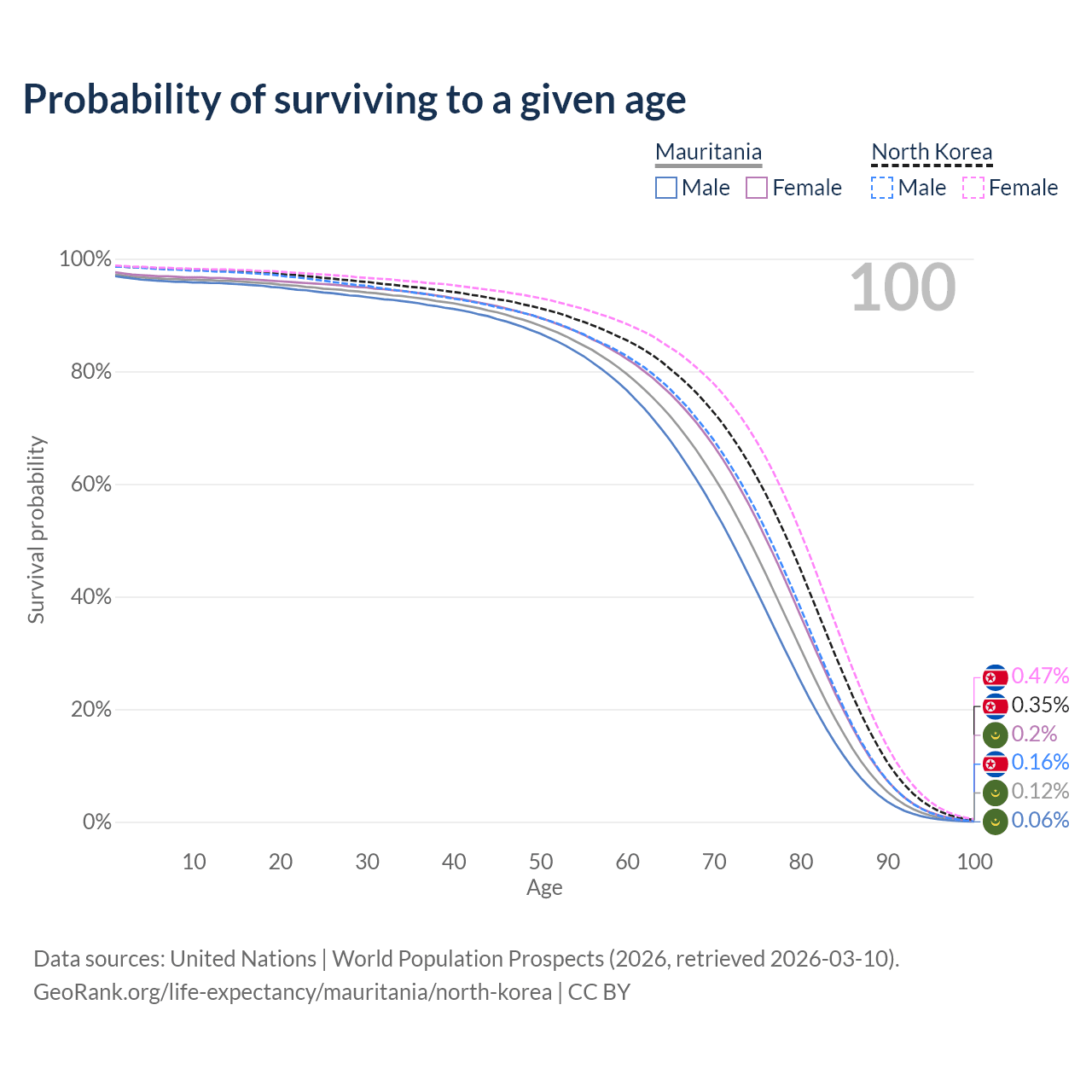 This life expectancy calculator shows the odds of living to 100, 95, 90, and below based on current age for both males and females in Mauritania and North Korea, along with mean and median age of death. The calculations are based on the 2026 life tables (actuarial tables) from the UN World Population Prospects.