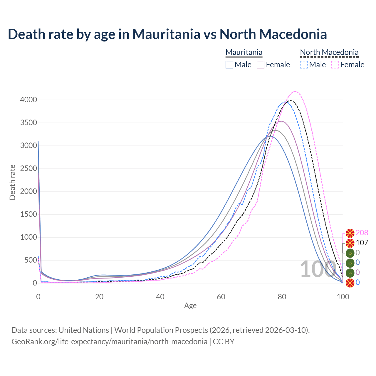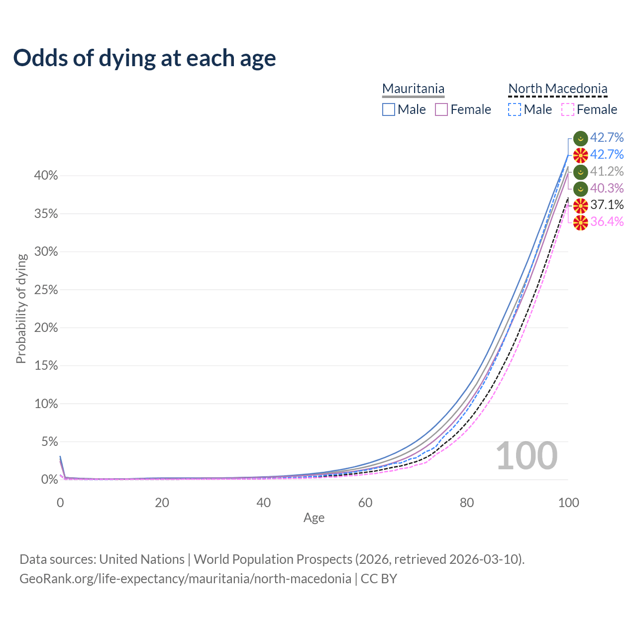 This life expectancy calculator shows the odds of living to 100, 95, 90, and below based on current age for both males and females in Mauritania and North Macedonia, along with mean and median age of death. The calculations are based on the 2026 life tables (actuarial tables) from the UN World Population Prospects.