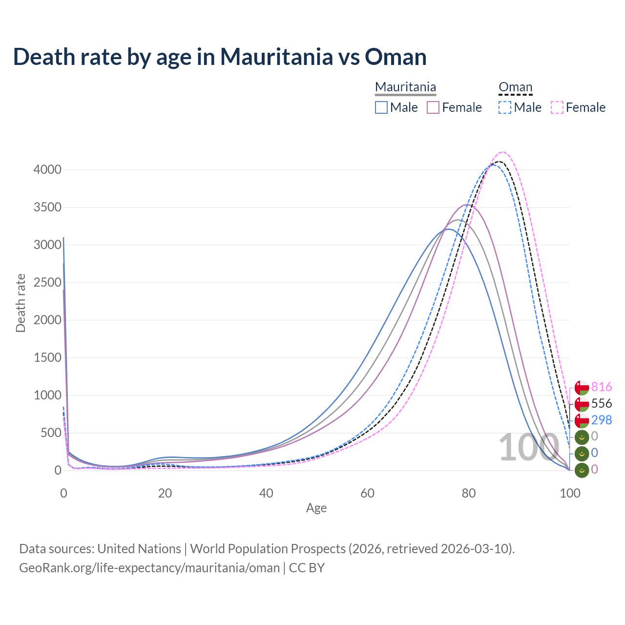 In Mauritania, the most common age of death is 78, compared to 86 in Oman. The median age of death is 74.1 in Mauritania and 83.5 in Oman, meaning only half of each cohort is expected to live past that age.