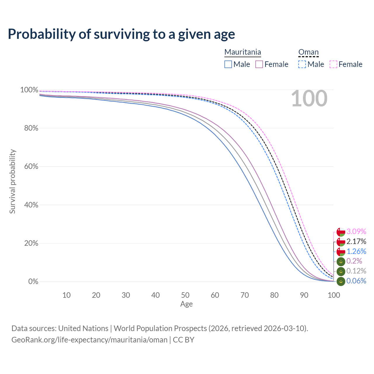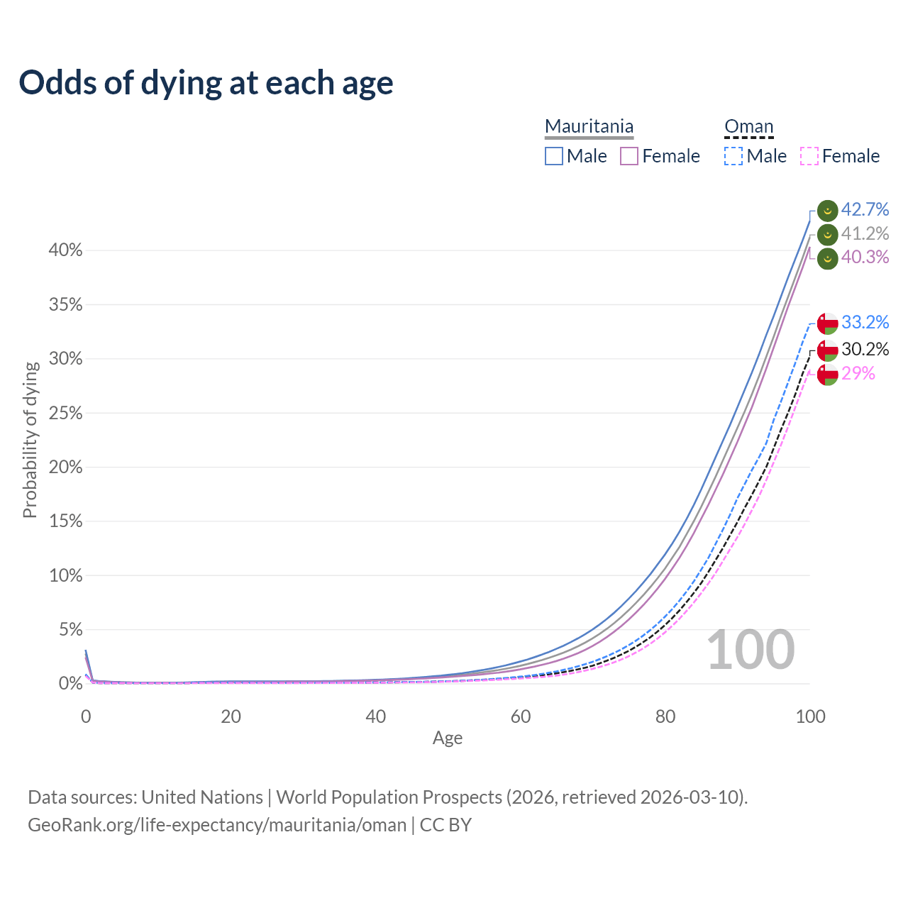 This life expectancy calculator shows the odds of living to 100, 95, 90, and below based on current age for both males and females in Mauritania and Oman, along with mean and median age of death. The calculations are based on the 2026 life tables (actuarial tables) from the UN World Population Prospects.