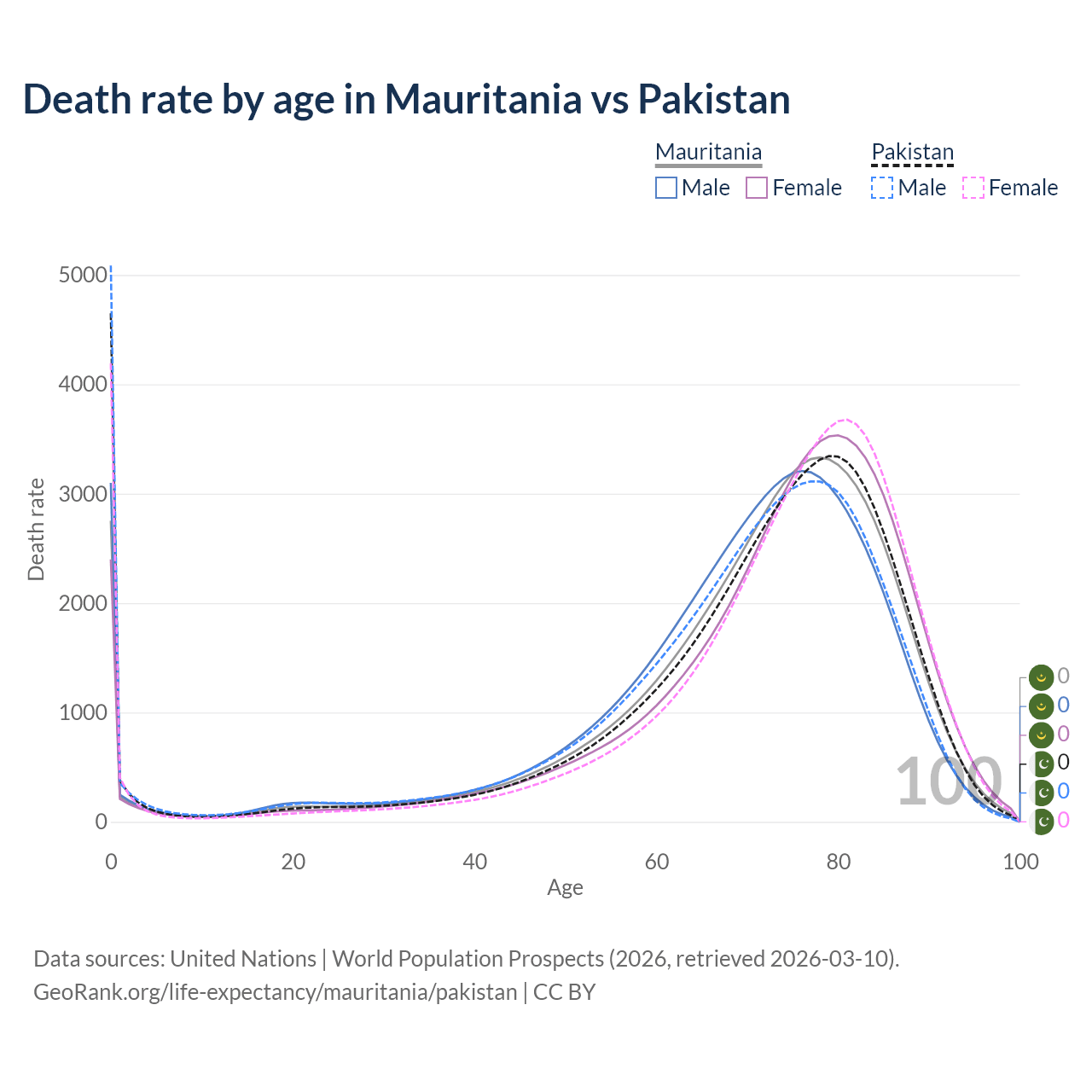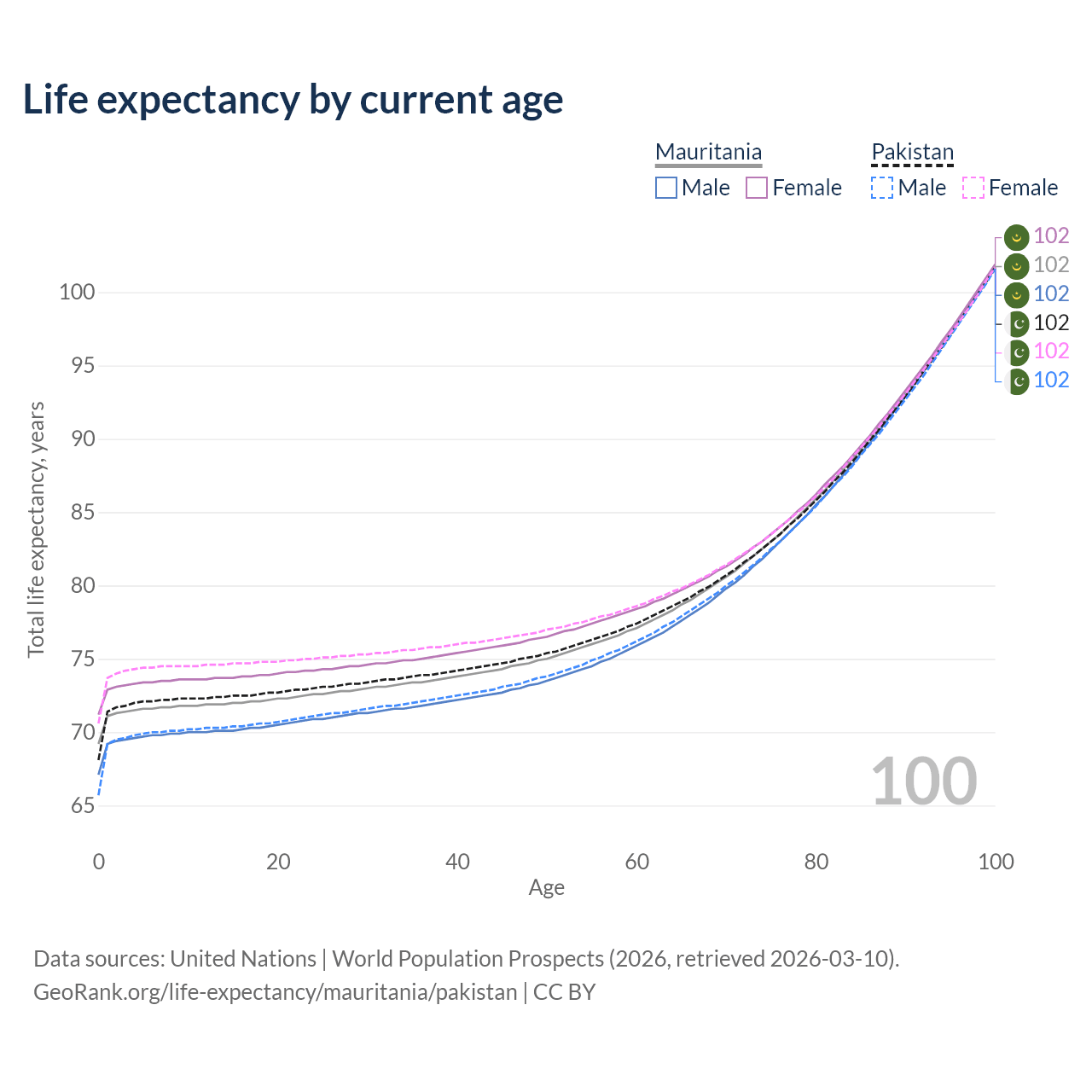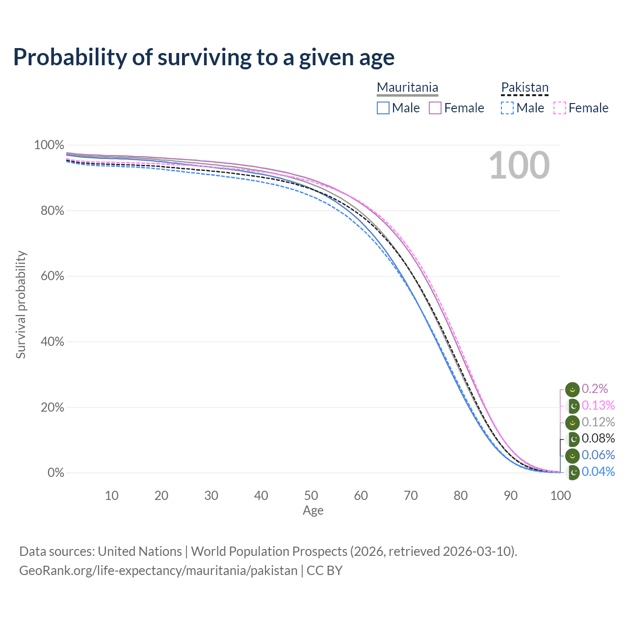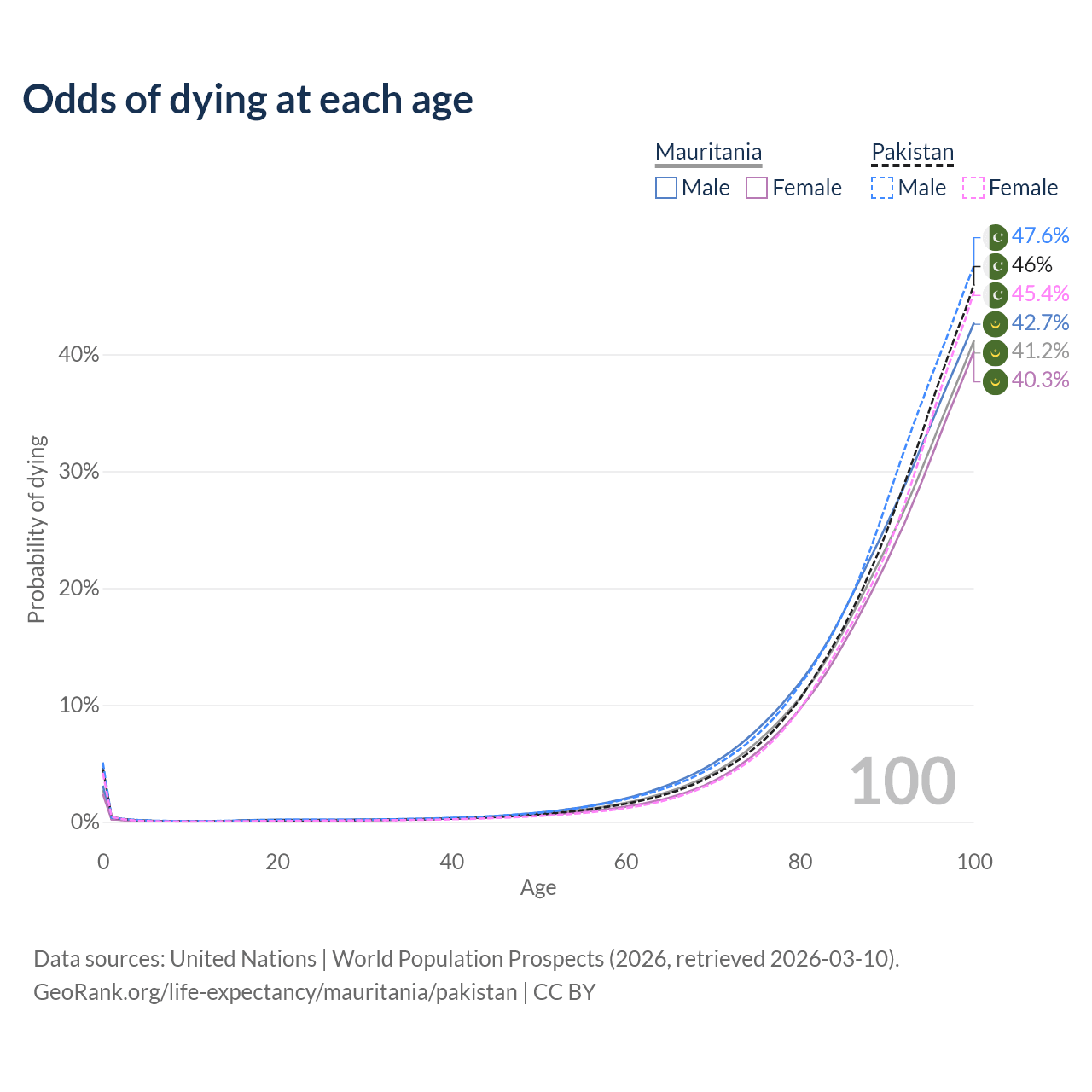 This life expectancy calculator shows the odds of living to 100, 95, 90, and below based on current age for both males and females in Mauritania and Pakistan, along with mean and median age of death. The calculations are based on the 2026 life tables (actuarial tables) from the UN World Population Prospects.