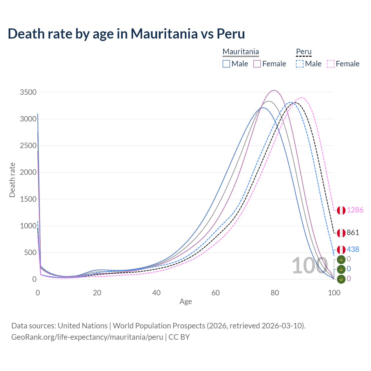In Mauritania, the most common age of death is 78, compared to 87 in Peru. The median age of death is 74.1 in Mauritania and 82.4 in Peru, meaning only half of each cohort is expected to live past that age.