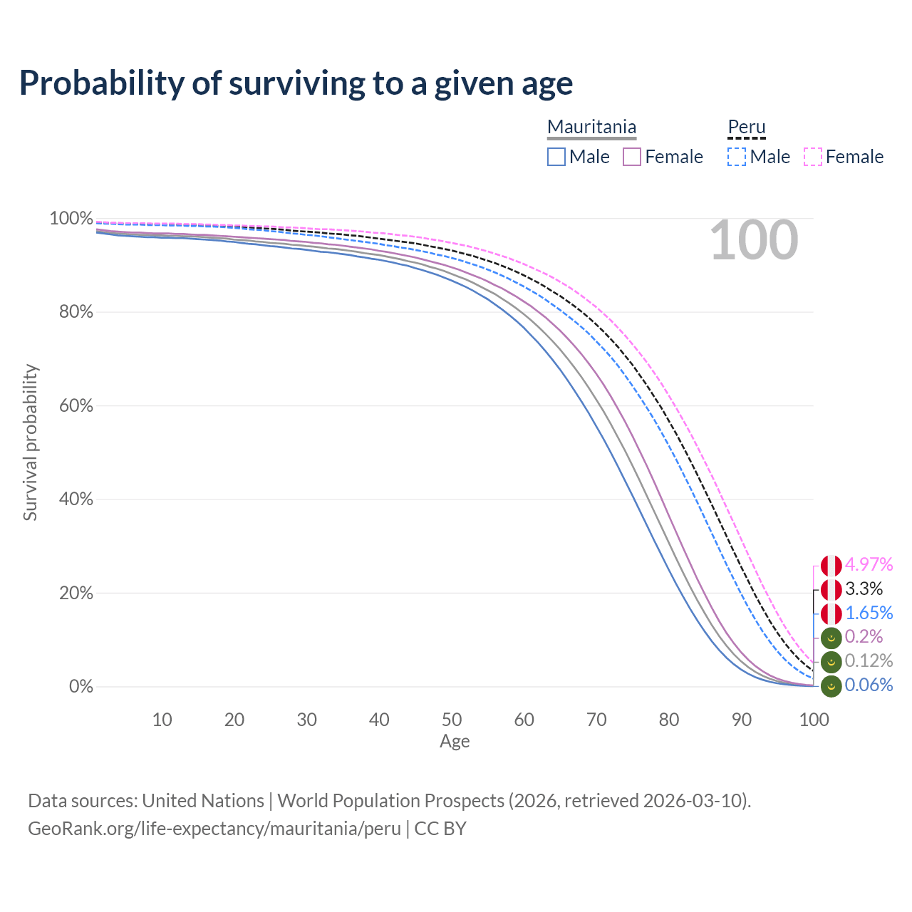 This life expectancy calculator shows the odds of living to 100, 95, 90, and below based on current age for both males and females in Mauritania and Peru, along with mean and median age of death. The calculations are based on the 2026 life tables (actuarial tables) from the UN World Population Prospects.