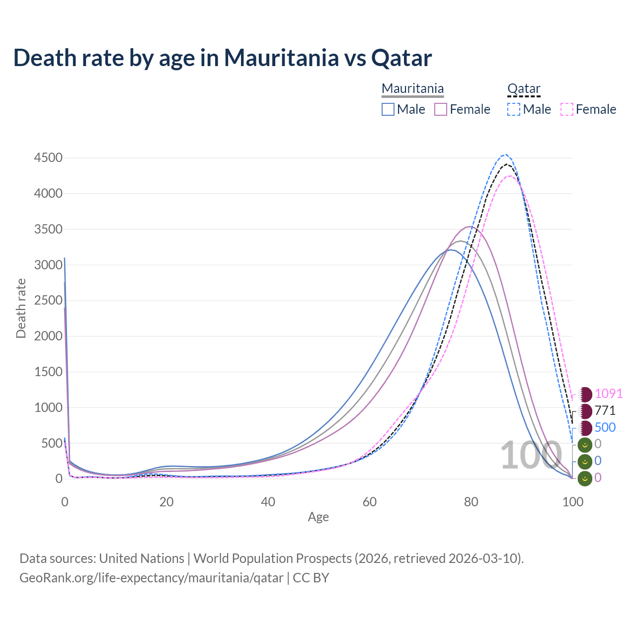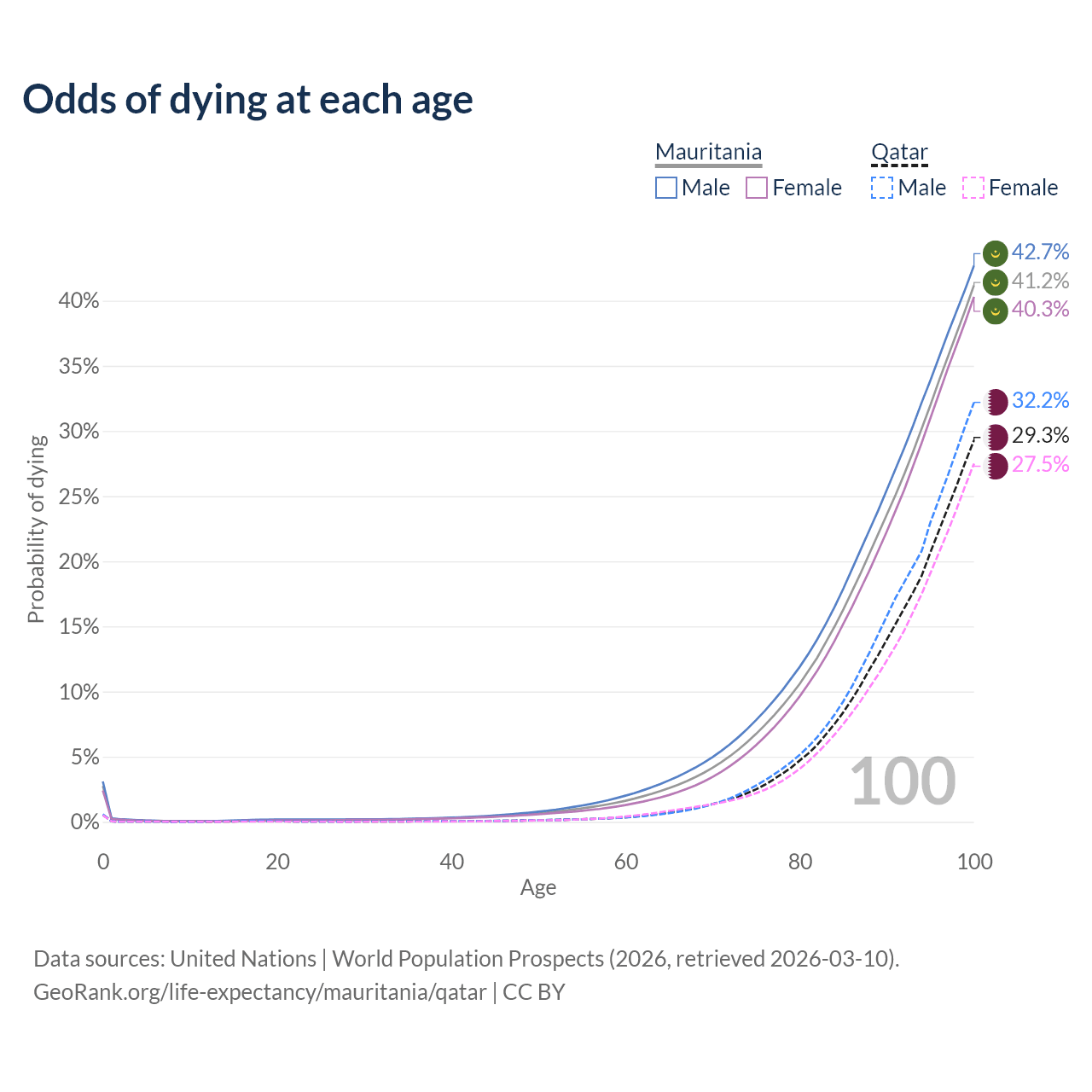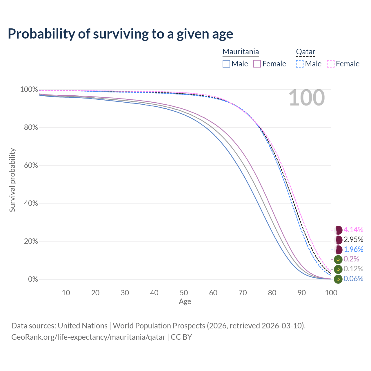 This life expectancy calculator shows the odds of living to 100, 95, 90, and below based on current age for both males and females in Mauritania and Qatar, along with mean and median age of death. The calculations are based on the 2026 life tables (actuarial tables) from the UN World Population Prospects.