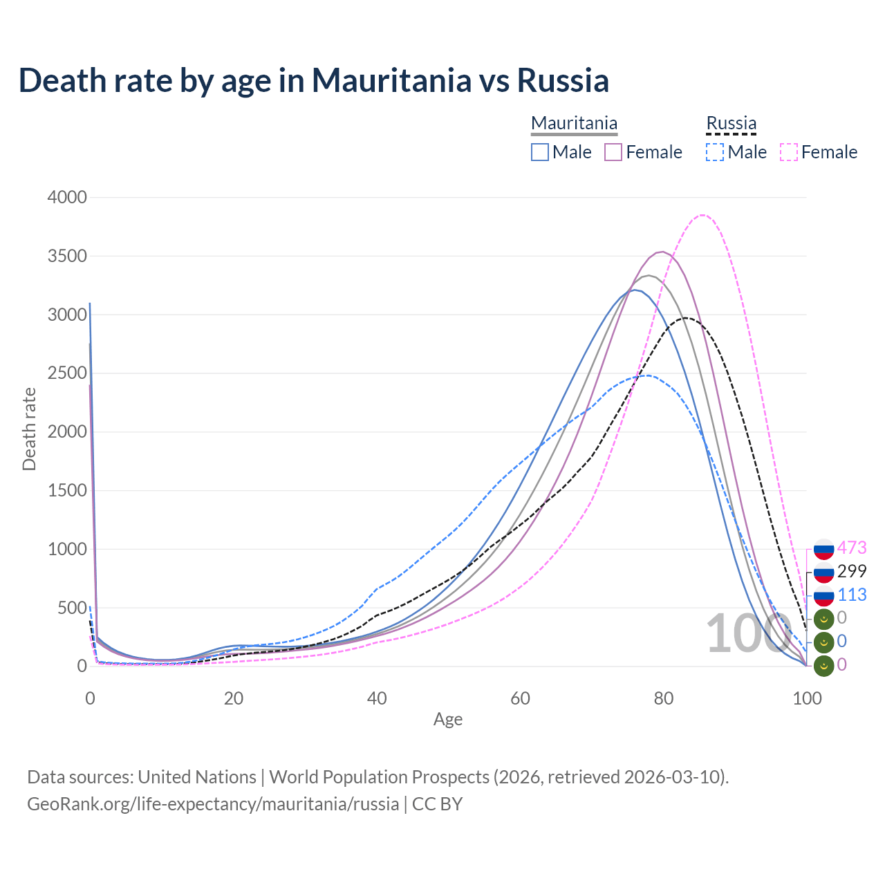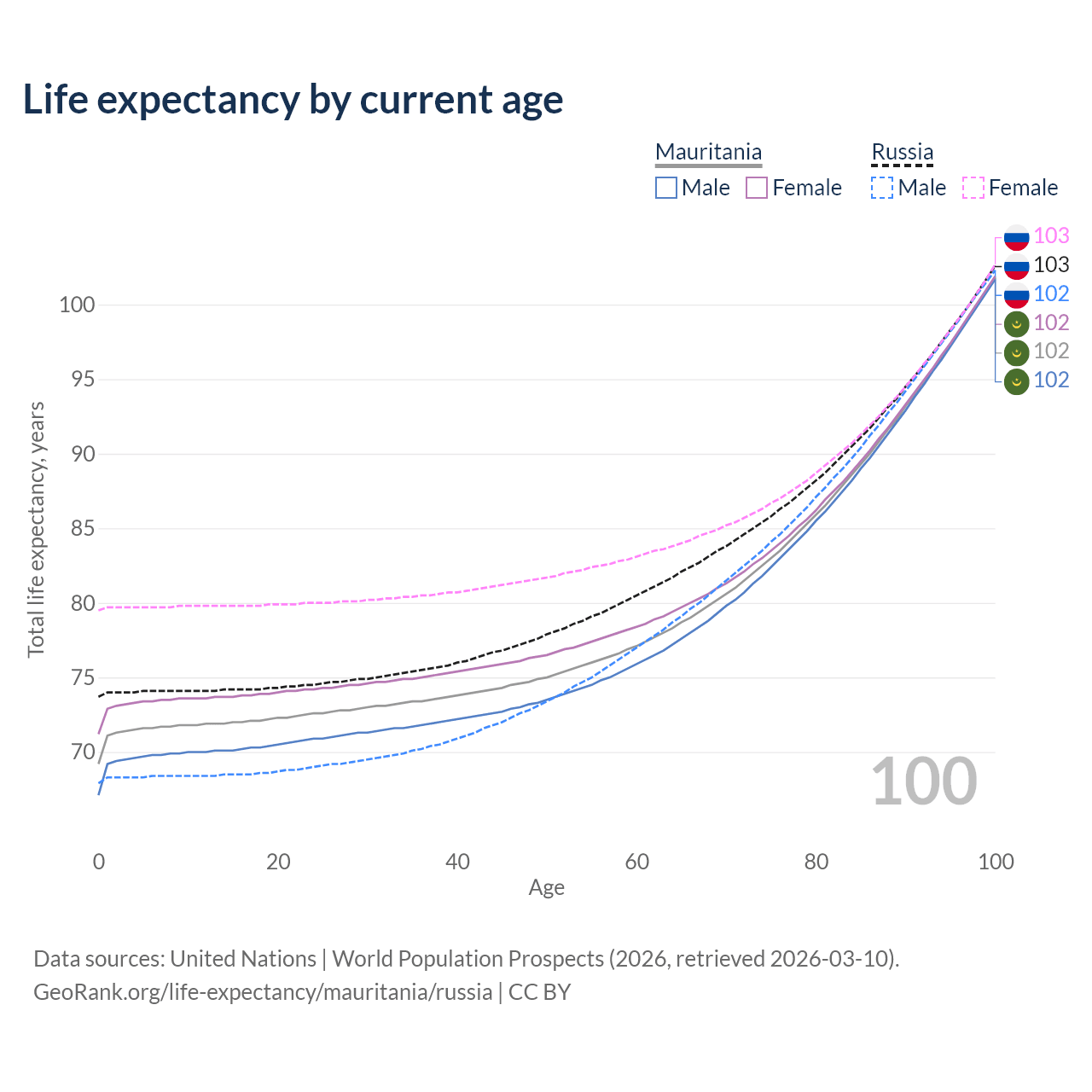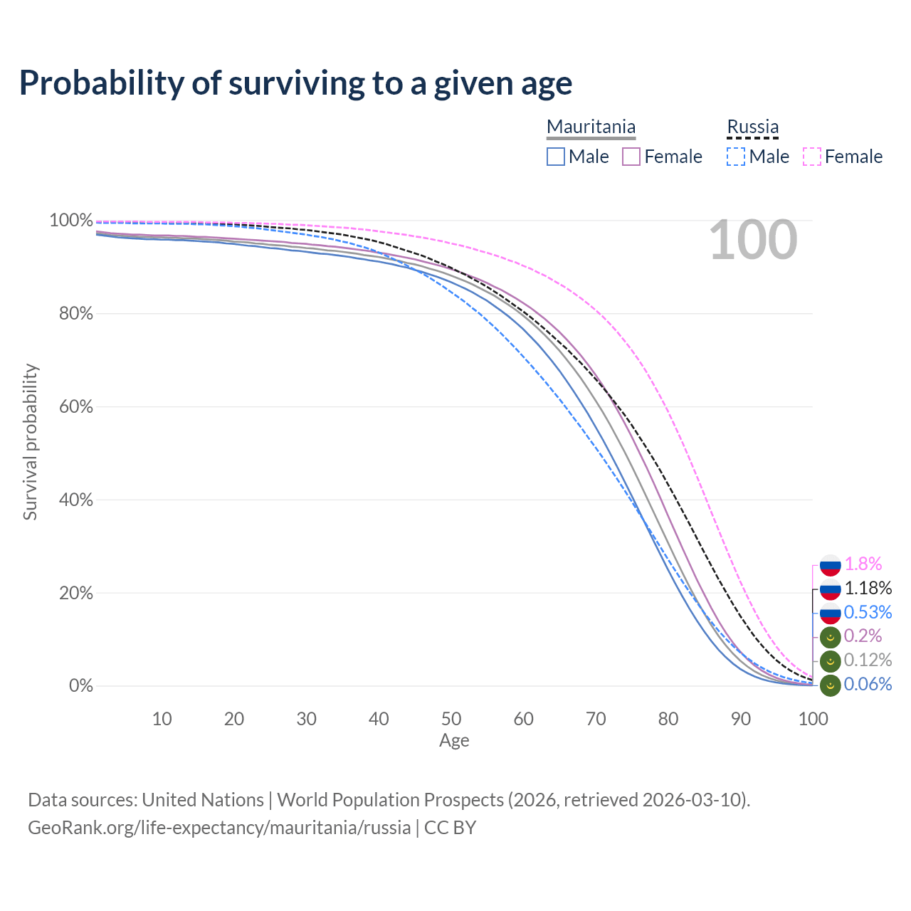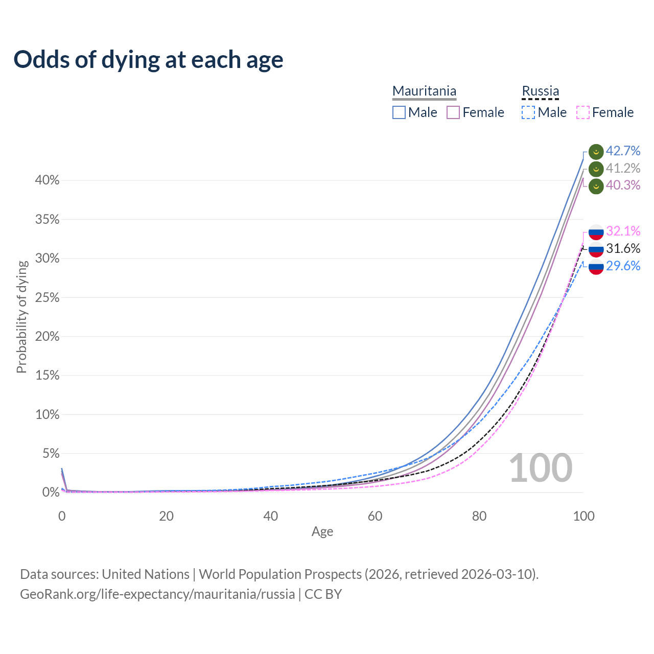 This life expectancy calculator shows the odds of living to 100, 95, 90, and below based on current age for both males and females in Mauritania and Russia, along with mean and median age of death. The calculations are based on the 2026 life tables (actuarial tables) from the UN World Population Prospects.