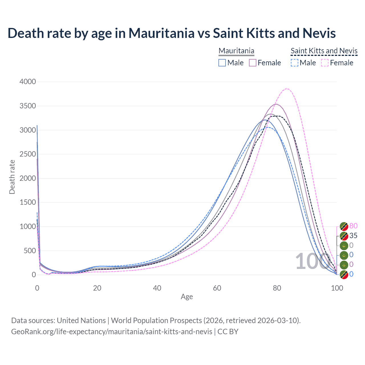In Mauritania, the most common age of death is 78, compared to 80 in Saint Kitts and Nevis. The median age of death is 74.1 in Mauritania and 76.3 in Saint Kitts and Nevis, meaning only half of each cohort is expected to live past that age.