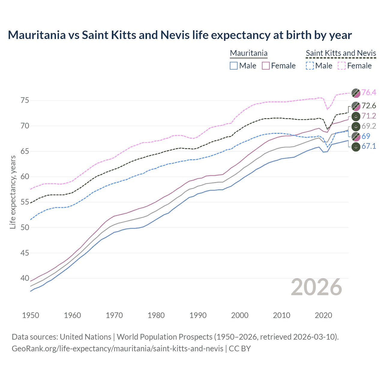 Mauritania vs Saint Kitts and Nevis life expectancy at birth by year